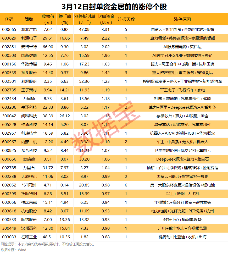 3月12日,A股市场收盘共94股涨停,剔除掉15只ST板块个股后,79股涨停;50股封板未遂,整体封板率为65.28%。 涨停战场:湖北广电5连板 据证券时报·数据宝统计,从收盘涨停板封单量来看,利源股份封单量最高,有52.36万手;其次是湖北广电、东方集团、奥瑞德,涨停板封单分别为47.09万手、44.68万手、30.20万手。 从连续涨停天数来看,信隆健康7连板,*ST同洲6连板,湖北广电5连板,园林股份4连板,狮头股份、襄阳轴承、联诚精密、塞力医疗3连板,广西广电、内蒙一机、天威视讯等10股2连板;其他还有正和生态5日4板等。 以封单金额计算,17股封单资金超1亿元,湖北广电、利通电子、麦格米特封单资金居前,分别为3.31亿元、2.22亿元、2.02亿元。 湖北广电具有云计算概念,公司此前在投资者问答平台上表示,参股公司湖北三峡云计算中心有限责任公司从事数据业务;此外,公司非公开发行包括拟募投“光谷IDC数据中心建设项目”。