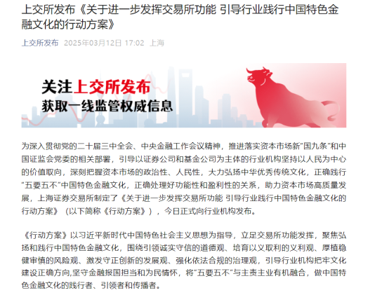 上交所最新发布。 3月12日,上海证券交易所正式向行业机构发布《关于进一步发挥交易所功能引导行业践行中国特色金融文化的行动方案》(以下简称《行动方案》)。此举旨在引导以证券公司和基金公司为主体的行业机构坚持以人民为中心的价值取向,深刻把握资本市场的政治性、人民性,大力弘扬中华优秀传统文化,正确践行“五要五不”中国特色金融文化,正确处理好功能性和盈利性的关系,助力资本市场高质量发展。