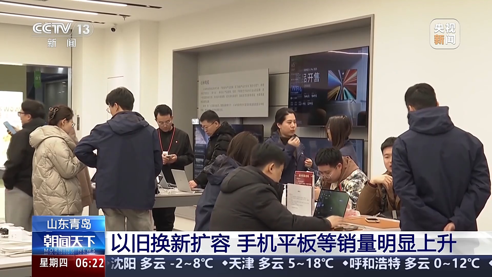 某通讯设备销售商店总经理 宋旭伟:今年销量挺好的,比去年同期增长了70%,除了手机之外,平板电脑、耳机、手表销量都非常好。 除了通信设备,当地汽车、家电市场也迎来购销两旺。 此外,当地还举行了“焕新出行 券享未来”购车优惠活动,发放200万元消费券。一些企业也推出满减、满赠、补贴等优惠活动,进一步激发消费市场的活力。 山东青岛:以旧换新扩容 手机平板等销量明显上升 在山东青岛,随着手机、平板等3C数码产品加入以旧换新补贴范围,在多重优惠政策的叠加下,家电市场销售红火。从1月20日开始补贴至今,青岛全市有12万消费者申请了3C数码产品补贴,总交易额约4.7亿元。
