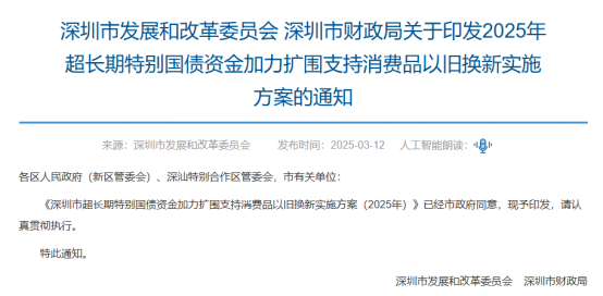今年以来,多地持续实施消费品“以旧换新”工作,持续加大各种补贴力度。 记者从深圳市发改委官网获悉,深圳市发改委、财政部联合印发《2025年超长期特别国债资金加力扩围支持消费品以旧换新实施方案》,提出要按照“市场为主、政府引导,总量控制、重点突出,分类实施、广泛参与”原则,统筹安排好中央向地方直接下达的超长期特别国债资金(以下简称国债资金)和市级财政配套资金,聚焦汽车、家电、家装、数码产品消费等领域,从头抓紧开展消费品以旧换新工作。
