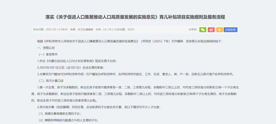 呼和浩特市祭出了促生育的大招。 呼和浩特市卫生健康委员会(下称“呼市卫健委”)3月13日发布相关文件称,对于今年3月1日之后(含3月1日)合法生育,且新生儿首次落户在该市的家庭,将予以育儿补贴。 补贴具体方案为:生育一孩一次性发放育儿补贴1万元;生育二孩发放育儿补贴5万元,按照每年1万元发放,直至孩子5周岁;生育三孩及以上发放育儿补贴10万元,按照每年1万元发放,直至孩子10周岁。