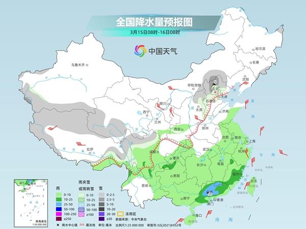 中央气象台预计,今天,内蒙古中部、黑龙江东北部、新疆南疆西南部、西藏东部和北部、川西高原、青海南部、甘肃中南部、陕西北部、宁夏、山西中北部、河北北部等地部分地区有小到中雪或雨夹雪,其中,内蒙古中部、山西北部、河北北部等地部分地区有大到暴雪。 明天,内蒙古中部、新疆南疆南部和西部山区、西藏北部和东部、川西高原中西部、青海南部、华北北部等地部分地区有小到中雪或雨夹雪,其中,河北北部局地有大雪。 气象部门提醒,华北北部降雪明显增强,陕西、山西、北京北部等地雨雪混杂,上述地区公众需注意防范道路湿滑、能见度降低等对交通出行的不利影响。 南方降雨、强对流进入最强时段 局地有大到暴雨 南方这次将以降雨为主,但降雨会更加“激烈”,部分地区有大到暴雨,并且伴随着雷暴大风等强对流天气。 中央气象台预计,今天,贵州北部、湖南中南部、江西大部、安徽南部、江苏南部、浙江西部和北部、福建中北部、广东北部、广西东北部等地部分地区有中到大雨,其中,湖南南部、江西南部、福建西部、广西东北部、广东北部等地部分地区有暴雨或大暴雨。