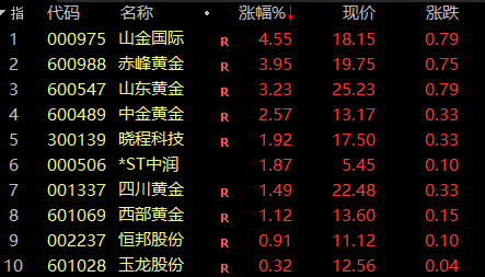 白酒股冲高,舍得酒业涨停,岩石股份、酒鬼酒、水井坊涨超6%,泸州老窖、老白干酒、皇台酒业、五粮液等涨幅居前。 另外,盘面上,黄金、小金属板块表现活跃;算力、AI应用、国资云概念走弱。 港股方面,恒生指数、恒生科技指数高开。黄金股亦表现活跃,山东黄金涨近4%,老铺黄金涨近3%。京东集团、阿里巴巴等涨近2%。 黄金股表现亮眼 盘初,黄金概念股走强,晓程科技、湖南黄金、赤峰黄金、盛达资源、西部黄金等集体高开。