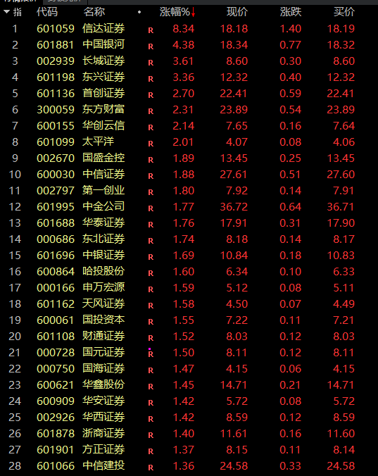3月14日,A股三大指数高开。截至发稿,创业板指涨幅扩大至1%。 盘中,券商股震荡走强,大金融板块走高,信达证券直线拉升触及涨停,安硕信息、志晟信息涨超10%,银之杰、新力金融、赢时胜、同花顺、指南针等快速跟涨。长城证券、东兴证券、国盛金控、东方财富、华泰证券、中信证券等跟涨。