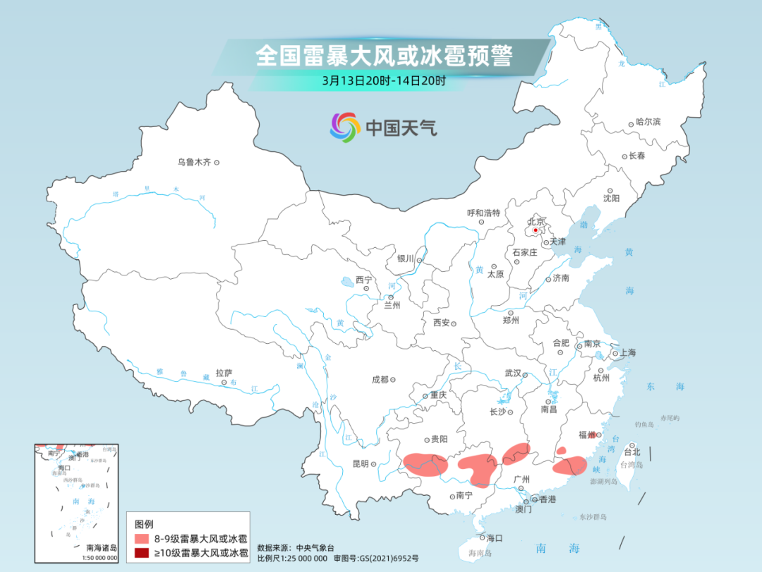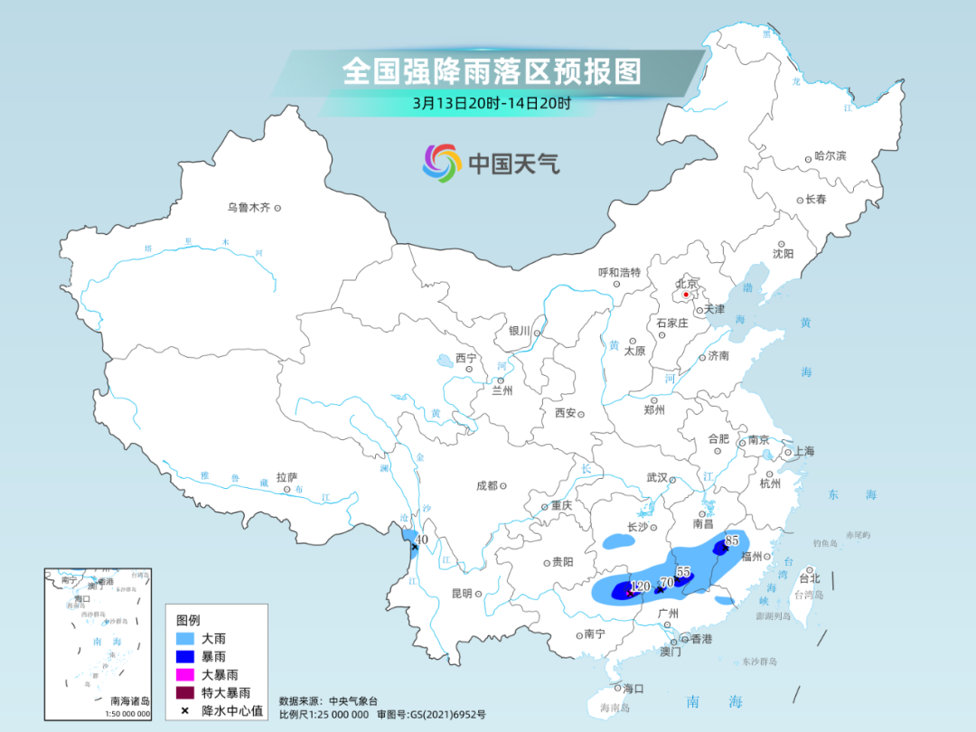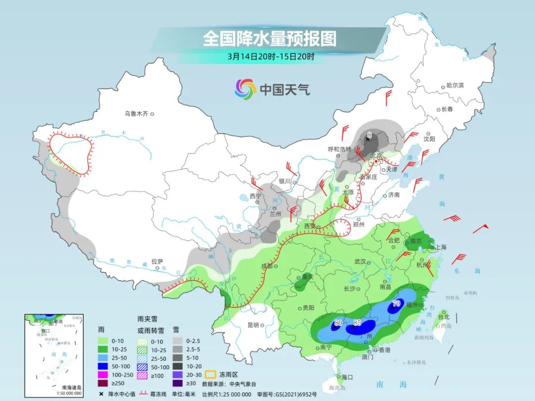城市中,像是西宁、兰州、大同、张家口,降雪都是稳稳的。太原有降水,但如果低空温度高于预期,将可能以降雨为主。北京明后天平原地区可能有小雨,西部、北部有雨夹雪或雪,主要降雨时段在明后天傍晚至夜间。 看到这次降雪过程,一些朋友要问了,3月中旬还下雪,是天气都混乱了吗?其实,对于陕西、山西、河北一带来说,常年最后一场雪基本出现在3月下旬到4月上旬,因此这时候出现降雪并不算少见。 雨雪天气下地面湿滑,天柱儿提醒上述地区的朋友出行要注意交通安全,驾车减速慢行,控制好车距。 南方降雨、强对流进入最强时段 北方有降雪的机会,南方被气温“卡脖子”了,这次过程将以降雨为主,但降雨会更加“激烈”,部分地区有大到暴雨,并且伴随着雷暴大风等强对流天气。 今天夜间到明天,西南暖湿气流加强,大气不稳定能量增加,降雨和强对流进入最强时段,江南东部和南部、华南北部等地将出现成片大雨出现,湖南南部、江西南部、福建西部、广西东北部、广东北部等地局地有暴雨或大暴雨,局地伴有8级以上雷暴大风、冰雹、短时强降水等强对流天气,中央气象台今晚发布了暴雨蓝色预警和强对流天气蓝色预警。