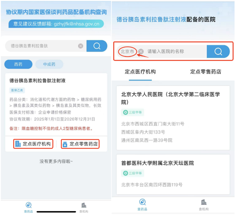最后,点击“定点医疗机构”或“定点零售药店”,即可查询该药品在各地区的配备情况。