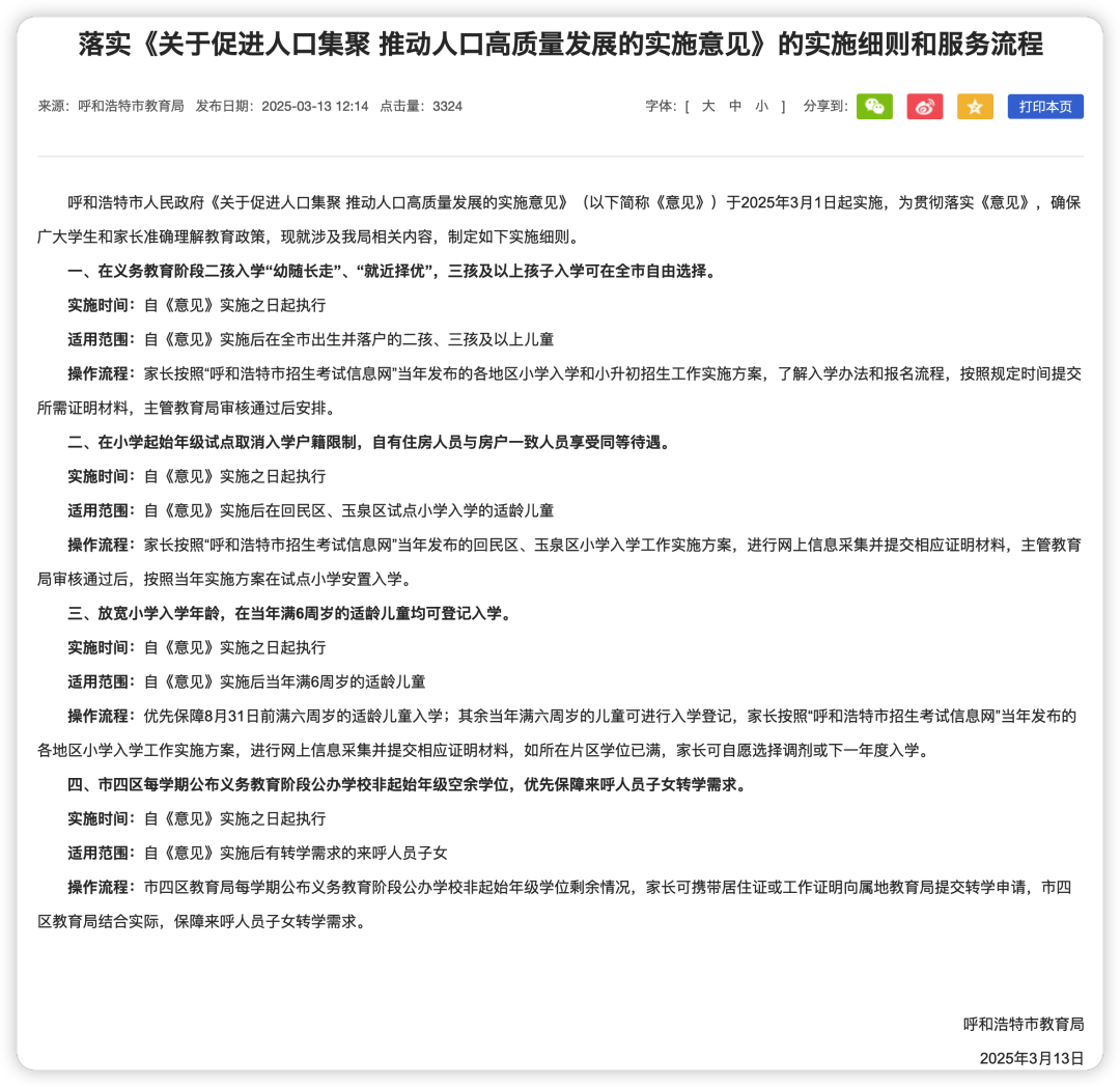 昨天,呼和浩特三孩补贴10万元的消息引发热议。今天,该地发布了新政策,继续加码配套措施——三孩及以上孩子入学可在全市自由选择学校。 内蒙古自治区呼和浩特市政府《关于促进人口集聚推动人口高质量发展的实施意见》(简称《意见》)于2025年3月1日起实施。 据内蒙古自治区呼和浩特市教育局网站消息,为贯彻落实《意见》,确保广大学生和家长准确理解教育政策,呼和浩特市教育局制定多项实施细则,其中明确,在义务教育阶段二孩入学“幼随长走”“就近择优”,三孩及以上孩子入学可在全市自由选择。