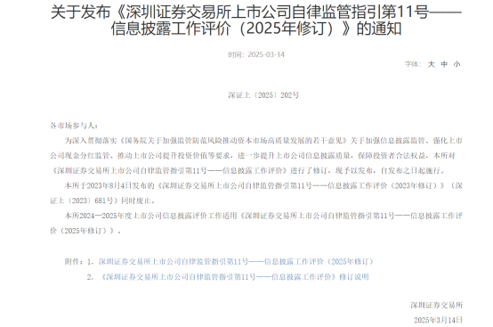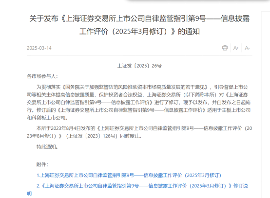 @上市公司,信息披露有新变化! 3月14日,沪深交易所均发布信息披露工作评价方面的自律监管指引(以下简称《评价指引》),自发布之日起施行。 证券时报记者注意到,《评价指引》新增财务真实性存在重大疑点的负面情形,同时明确具备分红能力但长期不分红的减分情形等。此外,《评价指引》还引导上市公司建立健全舆情应对工作机制,针对重大舆情及时作出澄清说明,同时要求上市公司高度关注投资者反响强烈的信息披露文字错误等情形。 沪深交易所表示,本次修订《评价指引》,是沪深交易所落实新“国九条”部署和“1+N”政策文件要求,强化上市公司信息披露监管,推动提升上市公司投资价值的积极举措。 新增负面情形细化减分情形 《评价指引》聚焦加强信息披露监管、严惩财务造假、强化现金分红监管、推动上市公司提升投资价值等工作部署,对上市公司信息披露质量提出更高要求。