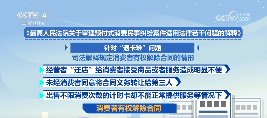 “收款不退”“限制转卡”等霸王条款无效 司法解释规定,收款不退、丢卡不补、限制转卡等“霸王条款”应依法认定无效。此外,针对“退卡难”问题,司法解释规定了消费者有权解除合同的情形。经营者“迁店”给消费者接受商品或者服务造成明显不便、未经消费者同意将合同义务转让给第三人、出售不限消费次数的计时卡却不能正常提供服务等情况下,消费者有权解除合同。