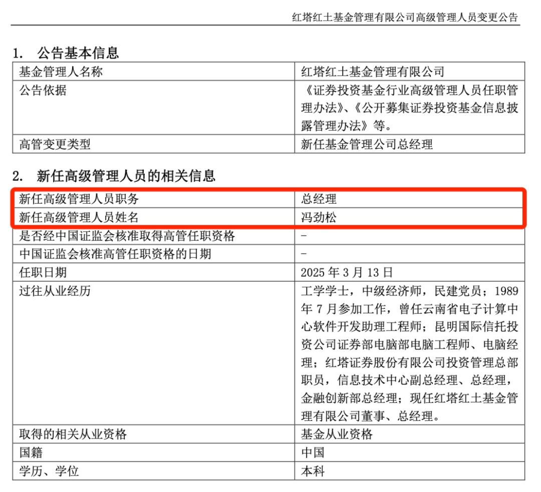 公开资料显示,冯劲松具有工学学士学位,中级经济师,民建党员;他于1989年7月参加工作,曾任云南省电子计算中心软件开发助理工程师;昆明国际信托投资公司证券部电脑部电脑工程师、电脑经理;红塔证券股份有限公司投资管理总部职员,信息技术中心副总经理、总经理,金融创新部总经理;现任红塔红土基金管理有限公司董事、总经理。 在新任总经理到岗之前,公司董事长江涛一度同时代理总经理、财务负责人、首席信息官等多个红塔红土基金的高管职务。随着总经理人选落定,自3月13日起,江涛不再代为履行总经理职务。 早在去年9月20日,公司总经理、财务负责人杨洁因工作安排离职,江涛代任总经理职务。到了去年11月中旬,红塔红土基金的大股东——红塔证券决定通过全国选聘的方式公开“海选”红塔红土基金总经理。 根据当时的选聘公告,总经理人选要求年龄在50周岁(含)以下,优秀者可适当放宽;对人选的工作经历明确需要具备8年以上与其拟任职务相关的证券、基金、金融、法律、会计、信息技术等工作经历,具备基金从业人员资格。而在管理经验方面,应聘人选担任证券基金经营机构部门负责人以上职务不少于2年,或者曾担任金融机构部门负责人以上职务不少于4年,或者具有相当职位管理经历。 不过从目前的结果看,红塔红土基金的新任总经理和上一任总经理杨洁一样,均出自大股东红塔证券内部。 非货基金规模不足30亿元 行业排名百名开外 据公司官网介绍,红塔红土基金成立于2012年6月12日,是国内第72家基金管理公司。公司总部位于深圳市南山区,由红塔证券股份有限公司、北京市华远集团有限公司、深圳市创新投资集团有限公司共同投资组建,注册资本为4.96亿元。 作为一家成立时间超过12年的基金公司,红塔红土基金目前在公募基金行业还是一家非货规模排名在百名开外的基金公司。 成立之初,红塔红土基金重点发展专户子公司业务,直到2014年9月18日,才发行成立公司旗下首只公募基金——红塔红土盛世普益混合基金。 之后,红塔红土基金也陆续发行成立了多只基金,Wind数据显示,截至2023年底,凭借债券基金规模攀升,红塔红土基金管理的非货基金规模一度突破100亿元,达到公司成立以来的最高点。不过,随着债基规模缩水,红塔红土基金管理规模有所下滑。