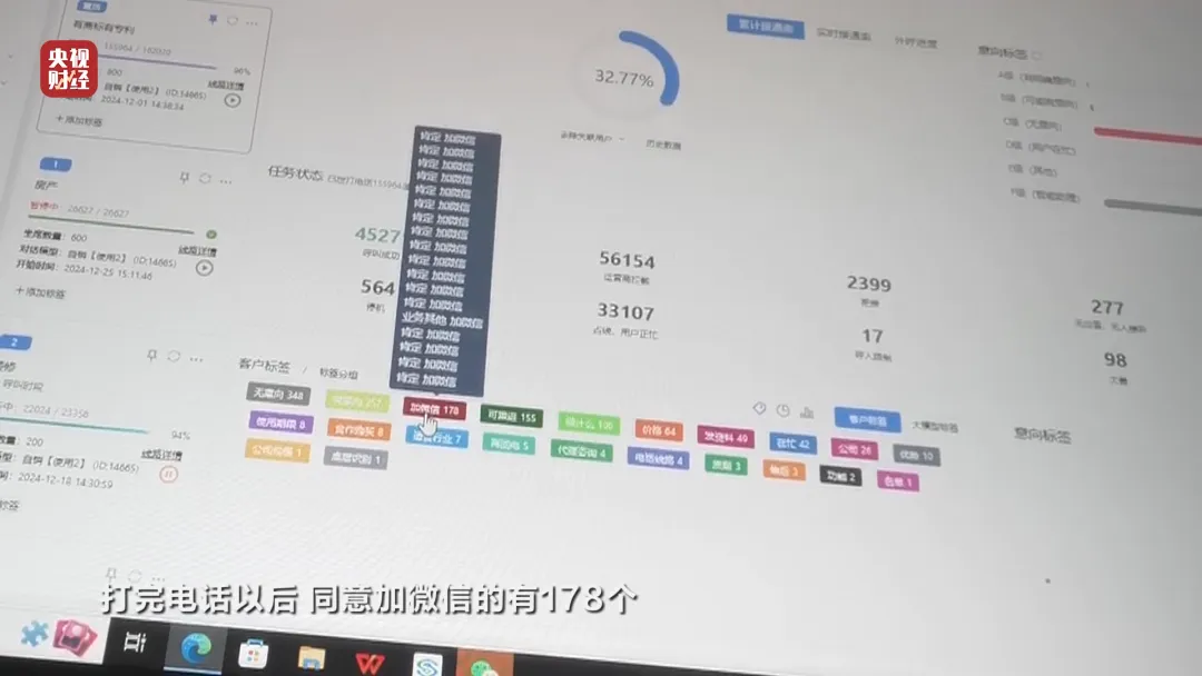 智优擎网络科技有限公司 田经理:因为AI种类分得很广,像我们这种是纯外呼AI,AI在前期,相当于无限去接近一个真正(的人),来帮你去呼叫这个电话。我们公司一个月要签大几十家公司。 田经理介绍,目前他们公司主要承接的业务涉及教育培训、健康医疗、建筑施工、金融贷款等行业,那么这些打营销电话的外呼智能机器人,到底长什么样呢?在记者的要求下,田经理打开了一套正在给客户测试运行中的系统后台,现场展示了他们的技术。