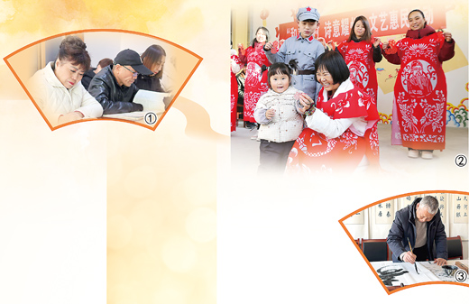 图①:村民们在王家河村乡村文学小院看书。 张玉钰摄 图②:村民在袁英民的乡村曲艺小院表演剪纸服装走秀。 赵军强摄 图③:张双全在书画小院练习书法。 本报记者李卓尔摄