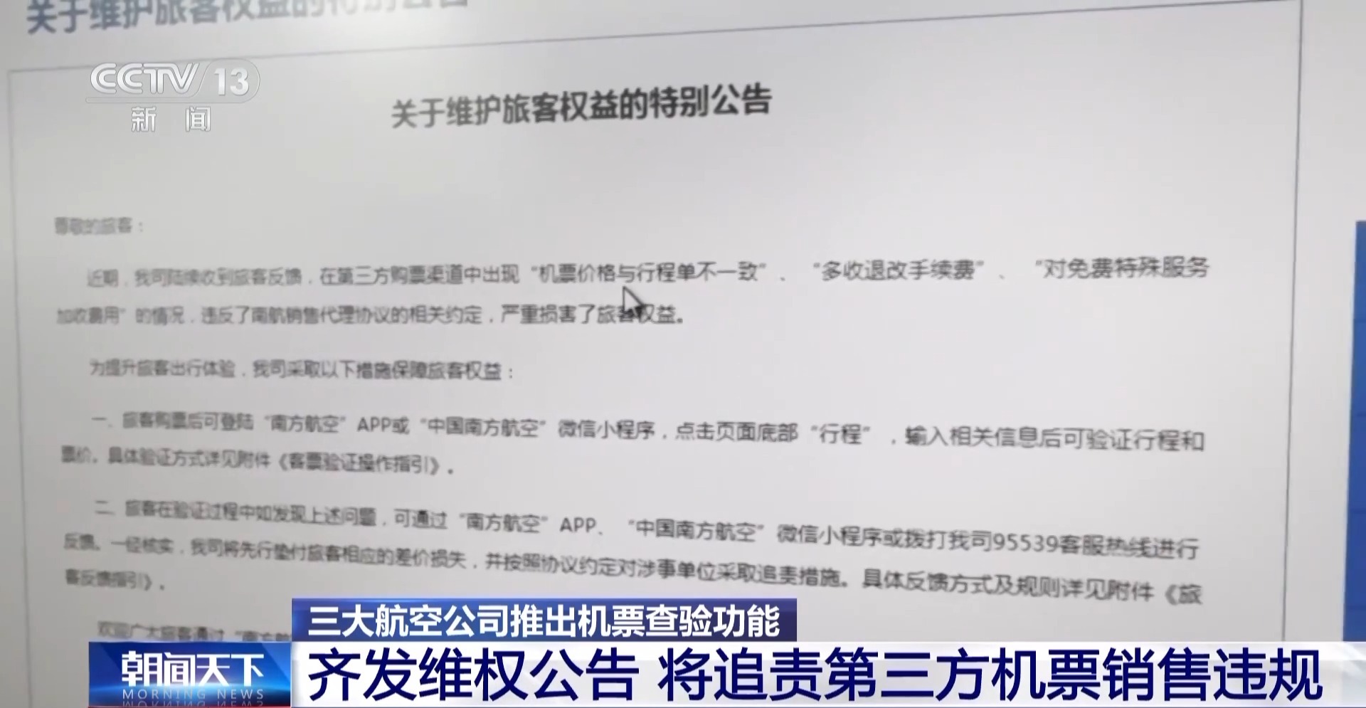 这两天,国航、东航、南航先后发布公告,针对第三方航空销售平台和代理人加价销售、篡改旅客行程等违规行为采取追责措施,并为旅客提供了机票验真和票价税费查询功能。这一举措能否有效解决机票市场存在的问题,保障消费者权益? 三大航公告中都提及了第三方航空销售的违规行为。其中,国航、东航都提到了航空销售代理人、航空销售网络平台购买机票时的加价销售、篡改旅客行程、多收机票退改手续费等行为。