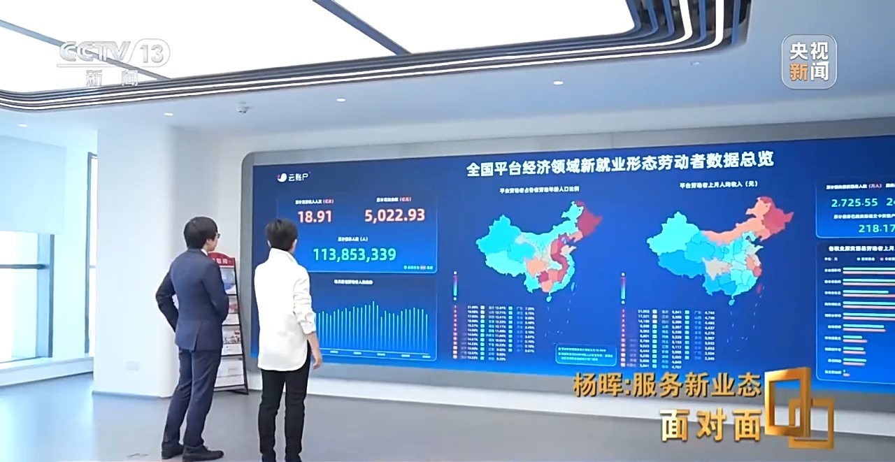 记者:一进门的大屏幕上有各种数据的总览,是全国平台经济领域新就业形态劳动者的数据,你们平台掌握了其中多少人的数据? 杨晖:云账户今天已经累计服务了超过1.1亿的新就业形态劳动者,同时我们也看到非常明显的趋势,还是有很多人在进入这样一个领域。 杨晖:我们每个月净新增超过一百万人,这样一个趋势在过去三年多没有变化过,一直保持着这样的水平。 记者:意味着可能每个月都有一百多万的人进入到灵活就业市场。 杨晖:完全新进入了这样的市场,并且选择了在我们公司的平台,我们纳入了他的数据统计。
