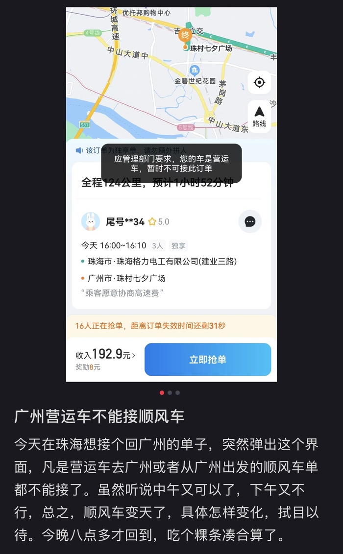 近日,有广东多地司机在社交媒体平台上表示,在接顺风车时被平台提示“应监管要求本市顺风车服务暂时关闭”或“应管理部门要求,因您的车是营运车,暂时停止接单服务”。有乘客也反馈,起始点在广州的顺风车订单一直无人接单。