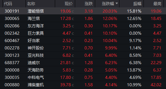 A股今日维持震荡整理走势,沪指小幅走高,盘中再创年内新高;北证50指数较为强势,一度涨超2%;港股方面,恒生指数强势上扬,一度涨超1%。 具体来看,沪指盘中窄幅震荡上扬,创业板、科创50指数等疲弱。截至收盘,沪指涨0.19%报3426.13点,深证成指跌0.19%报10957.82点,创业板指跌0.52%报2215.13点,科创50指数跌0.45%,北证50指数涨1.85%;沪深北三市合计成交16212亿元,较此前一日减少2200亿元。 场内逾3100股飘红,乳业股走势活跃,骑士乳业涨近13%,熊猫乳品涨约12%,阳光乳业、贝因美等斩获两连板;家电板块走强,星光股份、奇精机械涨停;地产板块拉升,光明地产、招商积余涨停;汽车产业链股强势,克来机电、明新旭腾、襄阳轴承等涨停,隆盛科技再创新高;华为海思概念爆发,晶赛科技、深圳华强涨停,智立方涨超10%;人形机器人概念热度不减,索辰科技、信质集团涨停,瑞迪智驱涨超14%;深海科技股崛起,潜能恒信、东方海洋、好当家等涨停,海兰信涨超12%。 深海科技概念崛起 深海科技概念盘中强势拉升,截至收盘,潜能恒信20%涨停,海兰信涨超12%,东方海洋、巨力索具、好当家、神开股份等均涨停。其中,东方海洋已连续3个交易日涨停。