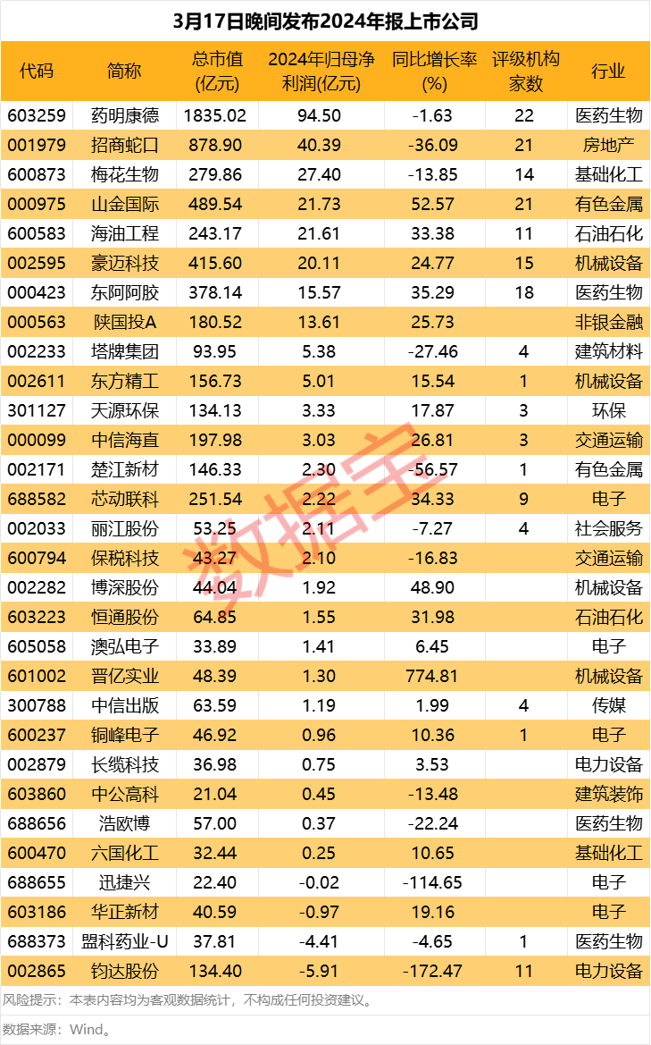 厦门港务是福建省港口集团旗下唯一的港口上市平台,厦门港大型的散杂货码头与综合物流服务商。本次重组将港务控股现有的港口优质资产注入,将上市公司打造为覆盖集装箱码头、散杂货码头、临港物流服务等多个细分业务领域的综合性现代港口物流服务公司,有利于增强上市公司的综合竞争实力,提升企业价值。 标的集装箱码头集团盈利能力较强,2023年、2024年营业收入分别为25.01亿元、27.23亿元;归母净利润分别为4.92亿元、5.62亿元。 厦门港务表示,根据标的公司未经审计的财务数据初步判断,本次交易预计构成上市公司重大资产重组。交易完成后,集装箱码头集团将成为上市公司的控股子公司,上市公司的控股股东仍为国际港务,实际控制人仍为福建省国资委,不会导致上市公司控制权发生变更。 经厦门港务申请,公司股票将于3月18日开市起复牌。值得关注的是,本次交易尚需公司董事会再次审议及公司股东大会审议批准,并经有权监管机构批准或同意注册后方可正式实施,能否实施存在不确定性。 CRO龙头2024年年报出炉! 3月17日晚间,30家上市公司发布2024年年报,其中不乏药明康德、招商蛇口、东阿阿胶等行业龙头上市公司。 药明康德2024年实现营业收入392.41亿元,同比下降2.73%;归母净利润为94.5亿元,同比下降1.63%。虽然经营同比下降,但公司顺利兑现了业绩承诺。此前,公司在2023年年报中表示,预计2024年收入达到383亿元~405亿元,剔除特定商业化生产项目后预计增长率为2.7%~8.6%。2024年剔除去年新冠商业化项目后营业收入同比增加5.2%。 值得关注的是,公司发布年度利润分配方案,拟每10股派发现金红利9.82元(含税)。同时,公司披露回报股东特别分红方案,拟每10股派发特别现金红利3.5元(含税)。合计向全体股东每10股派发现金红利13.32元(含税)。 公司预计2025年持续经营业务收入重回双位数增长,同比增长10%~15%,整体收入达到415亿元~430亿元。公司将持续聚焦CRDMO核心业务,在新产能逐步投放的情况下,不断提高生产经营效率。 招商蛇口2024年实现营业收入1789.48亿元,同比增长2.25%;归母净利润为40.39亿元,同比下降36.09%。截至报告期末,公司剔除预收账款的资产负债率62.37%、净负债率55.85%、现金短债比为1.59,“三道红线”始终处于绿档。公司拟向全体股东每10股派发现金红利1.9353元(含税),不以公积金转增股本。