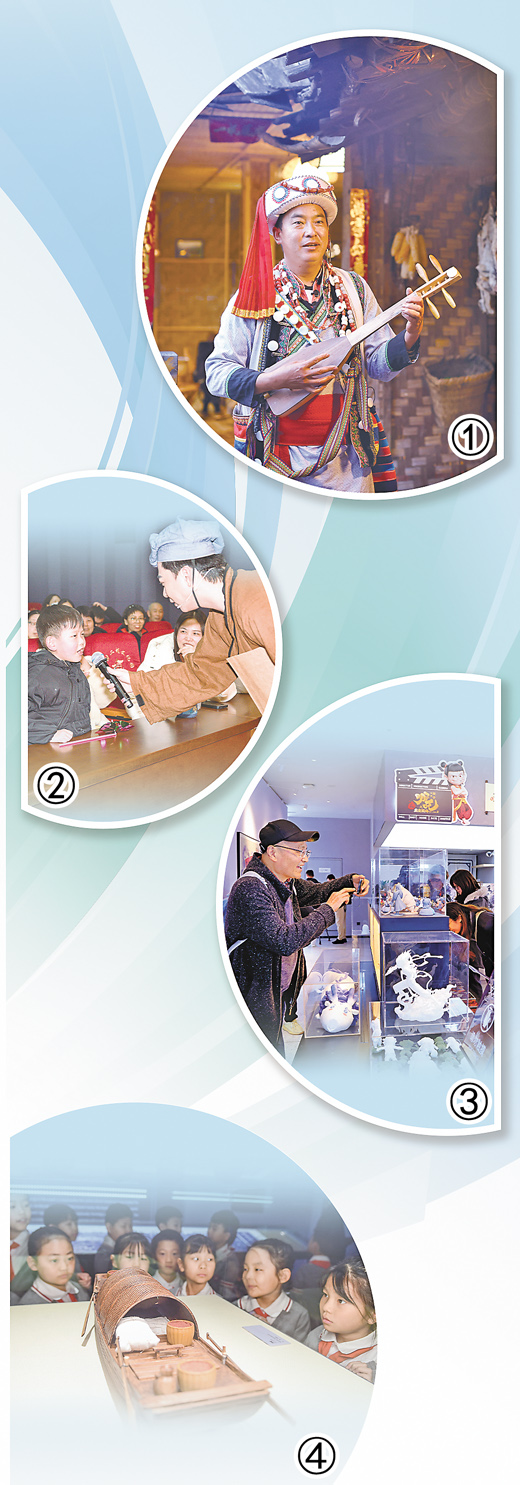 图①:郁伍林在表演。 高玉生摄 图②:“茉莉花开”文艺直通车活动中,演员与小观众互动。 尤佳伟摄 图③:观众在《哪吒之魔童闹海》幕后创作展拍照留念。 本报记者宋豪新摄 图④:学生在中国大运河非物质文化遗产展示馆观看乌篷船模型。 傅新春摄 3月5日,习近平总书记在参加江苏代表团审议时强调,“要深化城乡精神文明建设,优化文化产品和服务供给,以文化赋能经济社会发展。” “发展积极健康的网络文化”“推动优质文化资源直达基层”“加快发展新型文化业态”“推进文化遗产系统性保护”……今年《政府工作报告》里的文化关键词,与我们有什么关联,将如何改变我们的生活?“文化+”加出了哪些新业态、新机遇?让我们循着文化关键词,在故事里看变化、看发展。 ——编 者