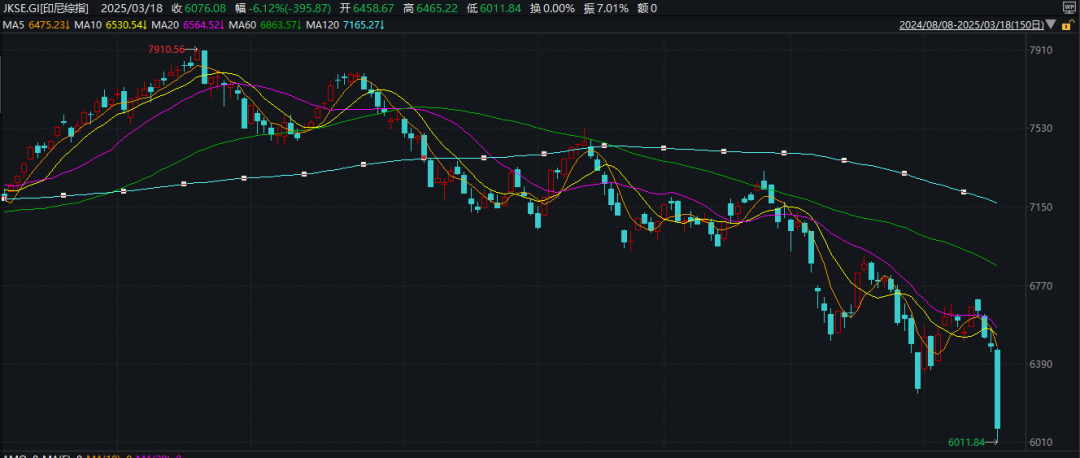 印尼股市暴跌! 周二,印尼股市开盘后持续下挫,印尼综合指数盘中重挫5%触发停牌机制。在重新交易后,股市继续下跌,印尼综合指数一度跌超7%,目前仍有6%以上跌幅。 分析认为,投资者对宏观经济的担忧和消费疲软,成为印尼股市近期持续回落的主要原因。 股市持续下跌 自上周四开始,印尼综合指数已经连续4个交易日下跌。今日,印尼股市更是大幅下挫,印尼综合指数盘中跌超7%,创下2021年9月以来的新低。自2024年9月创下7910.56点的历史新高后,印尼综合指数至今回落幅度超过20%,进入技术面上的熊市。