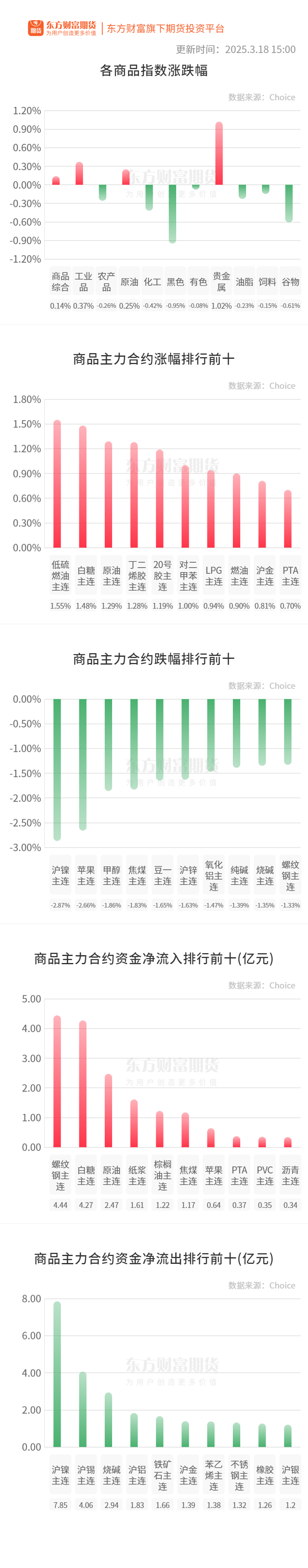 行情纵览![]() 宏观产经财联社:国家能源局发布2月份全社会用电量等数据。2月份,全社会用电量7434亿千瓦时,同比增长8.6%。从分产业用电看,第一产业用电量98亿千瓦时,同比增长10.2%;第二产业用电量4624亿千瓦时,同比增长12.4%;第三产业用电量1420亿千瓦时,同比增长9.7%;城乡居民生活用电量1292亿千瓦时,同比下降4.2%。1~2月,全社会用电量累计15564亿千瓦时,同比增长1.3%,其中规模以上工业发电量为14921亿千瓦时。 财联社:为深入学习贯彻2025年全国“两会”和2024年中央经济工作会议和精神,促进房地产开发企业了解宏观经济背景下房地产市场趋势,探索房地产发展新模式,推动房地产市场止跌回稳,中国房地产业协会定于2025年3月27—28日,在北京召开2025年房地产市场形势报告会暨全国一级资质房地产开发企业座谈会。 品种资讯黑色系期货 钢材:2025年1-2月,全国累计生产粗钢16630万吨,同比下降1.5%,累计日产281.86 万吨;生产生铁14075万吨、同比下降0.5%,累计日产238.56 万吨;生产钢材22409万吨、同比增长4.7%,累计日产379.81 万吨。(中钢协) 焦炭:18日港口焦炭现货市场暂稳运行。港口贸易集港情绪未有明显变化,港口库存较上一工作日暂稳运行。日照港47平,青岛港95平,两港总库存142较上周减3。后续走势需关注下游钢厂利润水平、焦煤成本端变化以及期货盘面情绪等情况对港口焦炭的影响。(我的钢铁网) 农产品期货 棕榈油:印尼官员称,印尼计划对棕榈油出口征收4.5%至10%的税费。(财联社) 大豆:截止到第11周末(3月15日),国内油厂平均开机率为42.41%,较上周的41.03%开机率增长1.38%。全国油厂大豆压榨总量为166.00万吨,较上周的160.59万吨增加了5.40万吨,其中国产大豆压榨量为4.13万吨,进口大豆压榨量为161.87万吨。本周预期大豆加工量小幅缩减至为153.08万吨,开机率为39.11%。(中国粮油商务网) 白糖:3月18日,我国进口巴西原糖(升水0.70)加工后成本约为5320元/吨(关税配额内,15%关税)或6823元/吨(关税配额外,50%关税);我国进口泰国原糖(升水1.60)加工后成本约为5358元/吨(关税配额内,15%关税)或6873元/吨(关税配额外,50%关税)。(我的钢铁网) 有色/贵金属期货 贵金属:芝商所(CME)将一公斤黄金期货(Gold Kilo)、伦敦现货黄金期货、伦敦现货白银期货和已清算的场外伦敦黄金远期(抵押保证金)合约下架,2025年3月17日生效。(财联社) 沪金:澳新银行将0-3个月期金价预测上调至3100美元/盎司,将六个月期预测上调至3200美元/盎司。(财联社) 沪铜:印度尼西亚批准自由港出口铜精矿。(财联社) 据了解,近期有大型贸易商将部分非洲非注册电解铜以散货船发往欧洲,置换可以发往美国COMEX的注册品牌电解铜。另据市场消息,4月中国到港的进口电解铜长单存在大量延期或取消现象,或令4月电解铜净进口量减少。(上海有色网) 工业硅:3月18日,SMM华东不通氧553#在10300-10400元/吨;通氧553#在10300-10500元/吨;521#在10800-11000元/吨;441#在10600-10800元/吨;421#在11100~11300元/吨;421#有机硅用在11900-12100元/吨;3303#在11600-11900元/吨。(上海有色网) 能化期货 原油:截至3月17日当周,山东地区独立炼厂的原油到港总量达到328.4万吨,环比大幅增加188.8万吨,增幅高达135.24%。相比之下,去年同期,山东独立炼厂的原油到港量为113.9万吨,环比减少70.9万吨,降幅为38.37%,当期到港的原油以中质原油为主,其中俄罗斯原油到港量为77.9万吨,稀释沥青则未有新到港记录。(隆众资讯) 尿素:2025年3月18日尿素行情小幅上行,部分地区价格上调10-30元/吨左右。(农时达情报) PVC:杭州PVC市场交投气氛一般,市场现货价格稳定,盘中价格弱势调整,电石法五型在4810-4950元/吨,三联4810-4840元/吨,宜化/天湖/中泰/金泰4820-4890元/吨,北元/天业4880-4950元/吨左右,八/三型5020-5080元/吨左右。(隆众资讯) 晚间关注无 (文章来源:东方财富研究中心) |