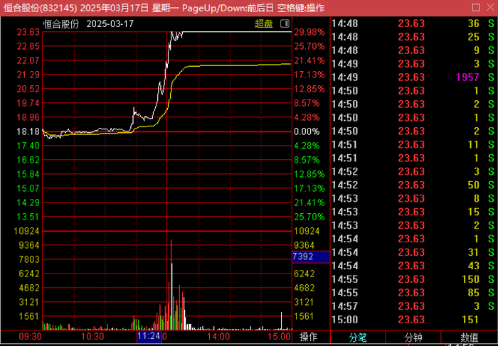3月17日,北交所发布1号和2号自律监管措施决定书。 中投鼎鸿(北京)投资基金管理有限公司和华睿千和(天津)资产管理有限公司旗下私募基金在交易北交所上市股票过程中,存在拉抬打压股价的异常交易行为,北交所对上述两家私募基金均采取限制证券账户交易的自律监管措施。 根据北交所披露的信息,3月17日,华睿千和(天津)资产旗下产品“华睿千和量化中性二号”和中投鼎鸿(北京)投资旗下产品“中投风起扶摇五号”账户均在交易恒合股份(832145.BJ)的过程中,存在拉抬打压股价的异常交易行为。 具体来看,“华睿千和量化中性二号”相关账户在13:00:00.40至13:01:55.73期间以21.61元/股至23.60元/股的价格买入恒合股份成交44.74万股、1038.91万元,期间买入成交占比达58.19%。在13:03:02.19至13:03:21.08期间以22.65元/股至23.63元/股的价格买入该股成交20.74万股、488.71万元,期间买入成交占比达88.00%。 “中投风起扶摇五号”相关账户在13:00:46.97至13:01:35.25期间以22.48元/股至23.50元/股的价格买入成交恒合股份”11.86万股、274.68万元,期间买入成交占比达36.35%。 从分时图上看,3月17日恒合股份在上午收盘前最后15分钟股价突然开始快速拉升,下午开盘仅3分钟后即被拉升至涨停价格,随后在涨停价格附近小幅震荡之后,于13:14分成功封住涨停板直至收盘。华睿千和(天津)资产和中投鼎鸿(北京)投资异常交易的时间段恰好是在该股首次拉升至涨停价格附近。