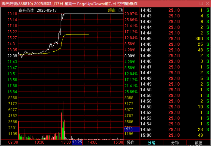 “中投风起扶摇五号”账户当日还在交易春光药装(838810.BJ)过程中存在拉抬打压股价的异常交易行为。 具体来看,该产品相关账户在11:06:43.58至11:08:30.06期间以26.26元/股至29.08元/股的价格买入成交春光药装30.70万股、860.11万元,期间买入成交占比达40.13%。 从分时图上看,3月17日大约在10:30附近,春光药装股价开始逐步走强,10:59以后加速上涨,在11:05左右的一波快速拉升以后日内首次触及涨停,随后在涨停价格附近小幅震荡之后,于11:14分成功封住涨停板直至收盘。“中投风起扶摇五号”异常交易的时间段同样是在该股首次拉升至涨停价格前后。