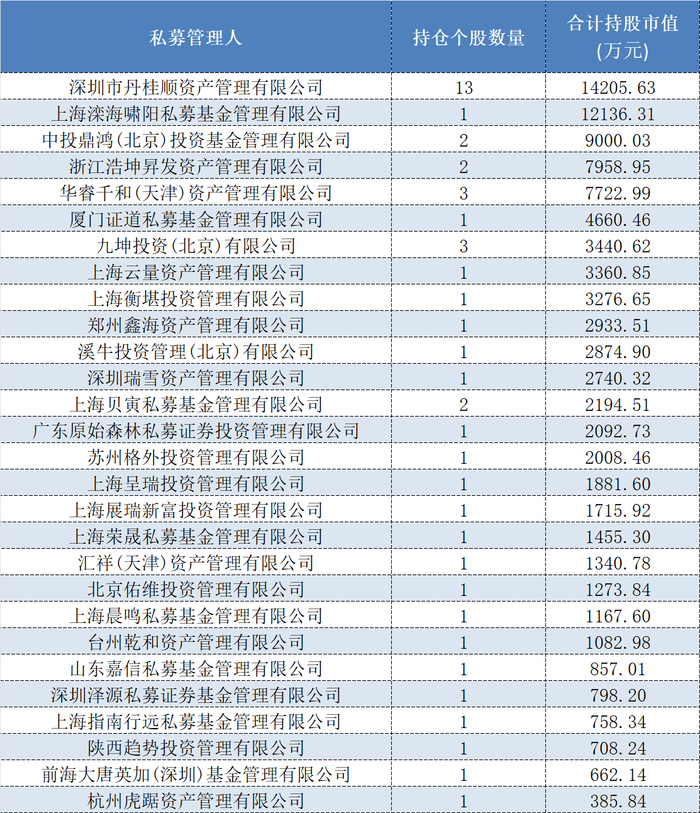 从持仓金额上看,多数私募对于北交所个股投入的资金量都不大,有23家私募合计持仓市值在5000万元以下,6家私募甚至持仓市值不足1000万元,同时只有2家私募持仓市值超过了1亿元。 其中,深圳市丹桂顺资产管理有限公司旗下产品共出现在13只北交所个股2024年三季报前十大流通股东中,累计持仓市值为1.42亿元;上海滦海啸阳私募基金管理有限公司则“独爱”丰光精密(430510.BJ),持仓市值为1.21亿元;百亿量化私募九坤投资旗下产品出现在3只北交所个股前十大流通股东中,持仓市值为3440.62万元。 |