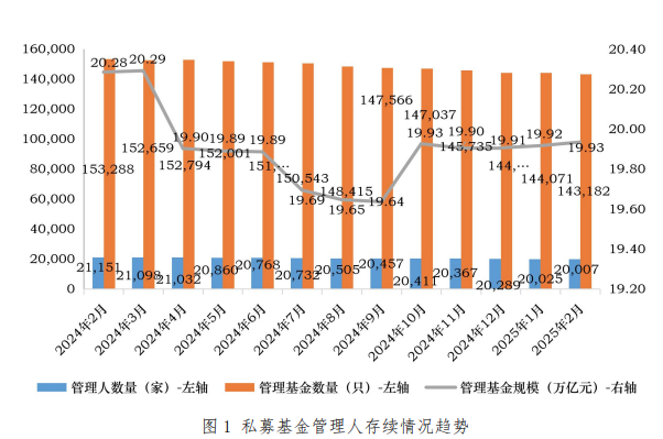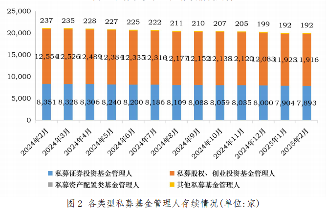 (来源:中国证券投资基金业协会官网) 2025年1月末至2月末,存续私募基金管理人数量从20025家减少至20007家,单月减少18家;基金数量从144071只降至143182只,减少889只。这一变化主要源于行业规范持续深化,1月注销私募基金管理人277家,2月注销24家,显示监管强化背景下“伪私募”“空壳机构”加速出清。 从新增备案情况看,2月新备案私募基金852只,备案规模达314.01亿元,较1月的1073只、465.84亿元分别下降20.6%和32.6%。其中,私募证券投资基金新备案规模从1月的253.72亿元降至152.11亿元,降幅达40%;私募股权基金新备案规模从1月的131.80亿元降至69.46亿元,缩水近半。唯一逆势增长的是创业投资基金,备案规模从1月的80.31亿元增至92.44亿元,单月增长15.1%,反映出政策引导下创投领域募资热度提升。 截至2月末,私募股权投资基金存续规模为10.95万亿元,创业投资基金为3.38万亿元,两者合计占比达71.9%,与1月末的71.8%基本持平。私募证券投资基金存续规模微增至5.24万亿元(1月末为5.23万亿元),占比为26.3%。尽管证券类管理人数量达7893家,但单只基金平均规模仅为0.6亿元,显著低于股权类基金的3.63亿元。 从管理人地域分布看,行业资源进一步向经济发达地区集聚。上海、北京、深圳、广东(除深圳)、浙江(除宁波)、江苏六地的私募基金管理人数量占比达72.16%,较1月上升0.02个百分点。其中,上海以3730家管理人位居首位,北京、深圳紧随其后,分别为3246家、3040家。 管理规模方面,上海、北京、深圳三地最高,合计占比为57.8%。其中,上海以4.92万亿元规模领跑,北京、深圳分别达4.65万亿元、1.95万亿元。 |