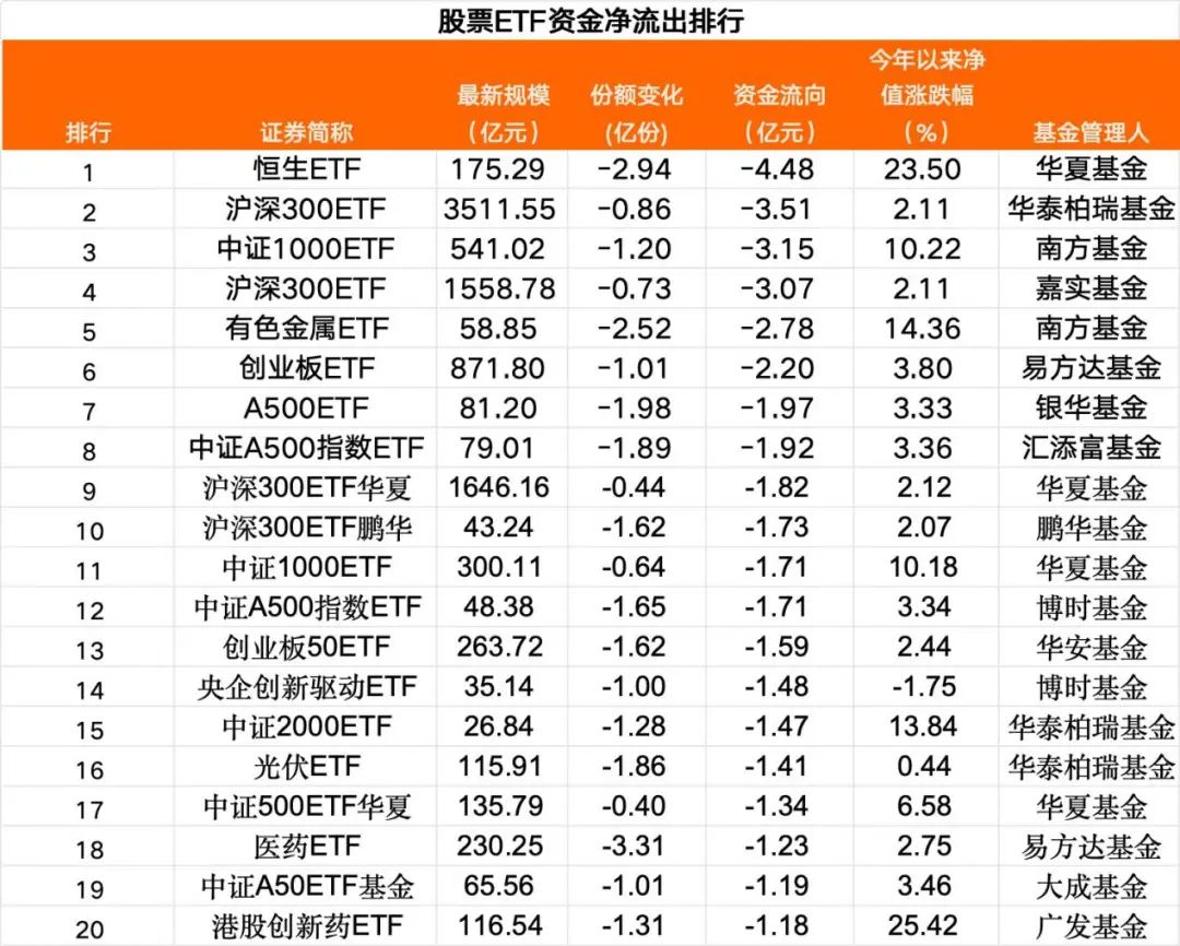 部分宽基和行业ETF资金净流出居前 3月19日,部分股票ETF资金净流出较多,超过1亿元的有24只,其中跟踪沪深300、中证1000等指数的宽基ETF“失血”靠前。 Wind数据显示,3月19日,净流出前20大股票ETF中,沪深300指数净流出金额居前,4只相关ETF合计净流出超10亿元;中证A500ETF有3只,资金净流出接近6亿元。此外,中证1000、创业板等指数相关ETF资金净流出也较多。 值得一提的是,3月以来市场持续震荡调整,股票ETF以资金净流出为主,合计“失血”超200亿元。港股通科技、港股通互联网、科创板等相关ETF资金净流入居前,跟踪沪深300、中证1000等指数的宽基ETF成为资金净流出主阵营。 富国基金认为,国内经济改善迹象已初露端倪,伴随两会落下帷幕,更加积极有为的宏观政策持续发力,A股行情仍可期。短期随着一季报业绩披露窗口临近,基本面对市场的主导力量有望增强,可重点关注受益于政策催化以及业绩确定性强的方向。 近期,港股市场再度成为投资者关注的焦点。对此,银华基金表示,随着内地与香港资本市场互联互通机制不断完善,叠加港股估值性价比不断凸显,越来越多的投资者开始将目光投向港股市场。 “然而,在港股市场交易热情高涨的背后也蕴藏了一定的风险:因其实行T+0交易机制,且不设涨跌幅限制,波动性较大;同时,受到全球经济环境、汇率波动等多重因素影响,投资风险同样不容忽视。”银华基金称。
