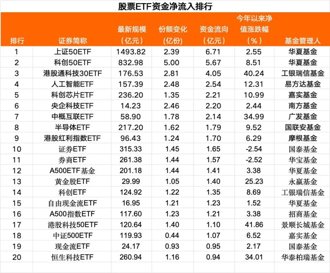 3月19日,A股市场震荡调整,三大指数小幅收跌。当日股票ETF出现超5亿元资金净流出,跟踪科创板50、港股科技、上证50等指数的宽基ETF,以及半导体、人工智能等行业主题ETF资金净流入靠前。 值得一提的是,3月以来,股票ETF以资金净流出为主,合计“失血”超200亿元。不过,部分代表性科创板宽基ETF逆势吸金超110亿元。 周三股票ETF资金小幅净流出,科创板宽基ETF成“吸金”主力 Wind统计显示,截至2025年3月19日,全市场股票ETF达到1031只(含跨境ETF,下同),总规模为3.44万亿元。 资金流向显示,3月19日,市场震荡之际,股票ETF净流出资金超5亿元。当日资金净流入超过1亿元的股票ETF达18只,科创、港股相关ETF吸金居前。华夏上证50ETF、华夏科创50ETF、工银瑞信科技30ETF位居前三,资金净流入均超4亿元。 来自易方达基金的数据显示,3月19日,五类ETF资金净流入居前,分别为科创板50指数(净流入8.9亿元)、港股科技指数(净流入6.8亿元)、上证50指数(净流入6.6亿元)、半导体指数(净流入5.8亿元)、人工智能指数(净流入5.7亿元)。 Wind统计显示,资金净流入前20大股票ETF中,港股科技或互联网相关ETF达到5只,科创相关ETF也达到3只。 值得一提的是,近期科创板相关宽基ETF成为吸金主力。3月以来,多只代表性科创板宽基ETF,如科创100ETF、科创50ETF、科创创业50ETF,以及科创综指ETF合计资金净流入超110亿元。 头部基金公司中,易方达基金ETF最新规模为6214.1亿元。3月19日,同类规模第一的人工智能ETF资金净流入2.5亿元,科创板50ETF资金净流入0.9亿元。 华夏基金ETF中,3月19日,上证50ETF和科创50ETF单日资金净流入居前,分别达6.71亿元和5.67亿元,最新规模分别达1493.82亿元和832.98亿元,对应跟踪指数近一月日均成交额分别为21.68亿元和49.10亿元。A500ETF基金、自由现金流ETF资金净流入都超1亿元。