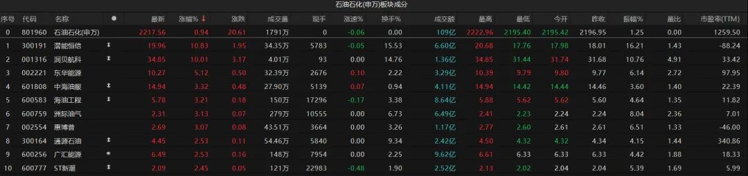 石油石化板块盘中拉升,整体收涨0.94%,板块内38只个股收涨,仅7只个股收跌。其中,潜能恒信大涨10.83%,润贝航科10CM涨停。此外,东华能源、中海油服、海油工程等多股跟涨。
