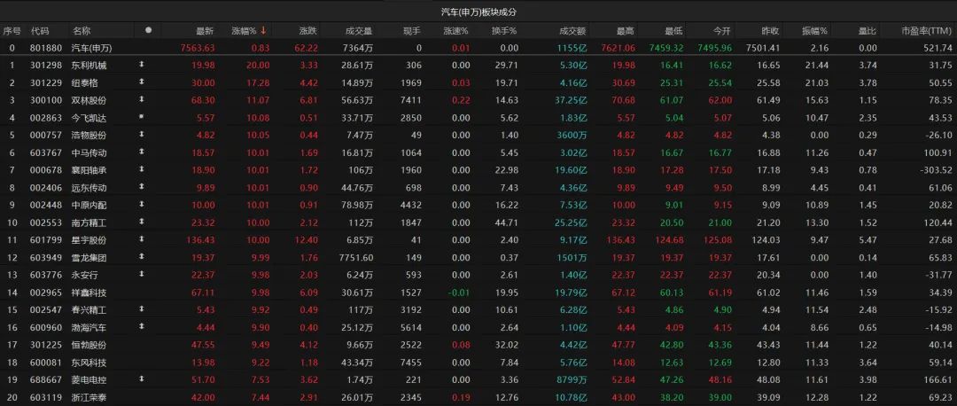 汽车板块盘中异动,整体收涨0.83%,板块内191只个股收涨,掀起涨停潮。东利机械20CM涨停,纽泰格大涨、双林股份涨超11%。此外,今飞凯达、浩物股份、中马传动、襄阳轴承、远东传动等10余股涨停。