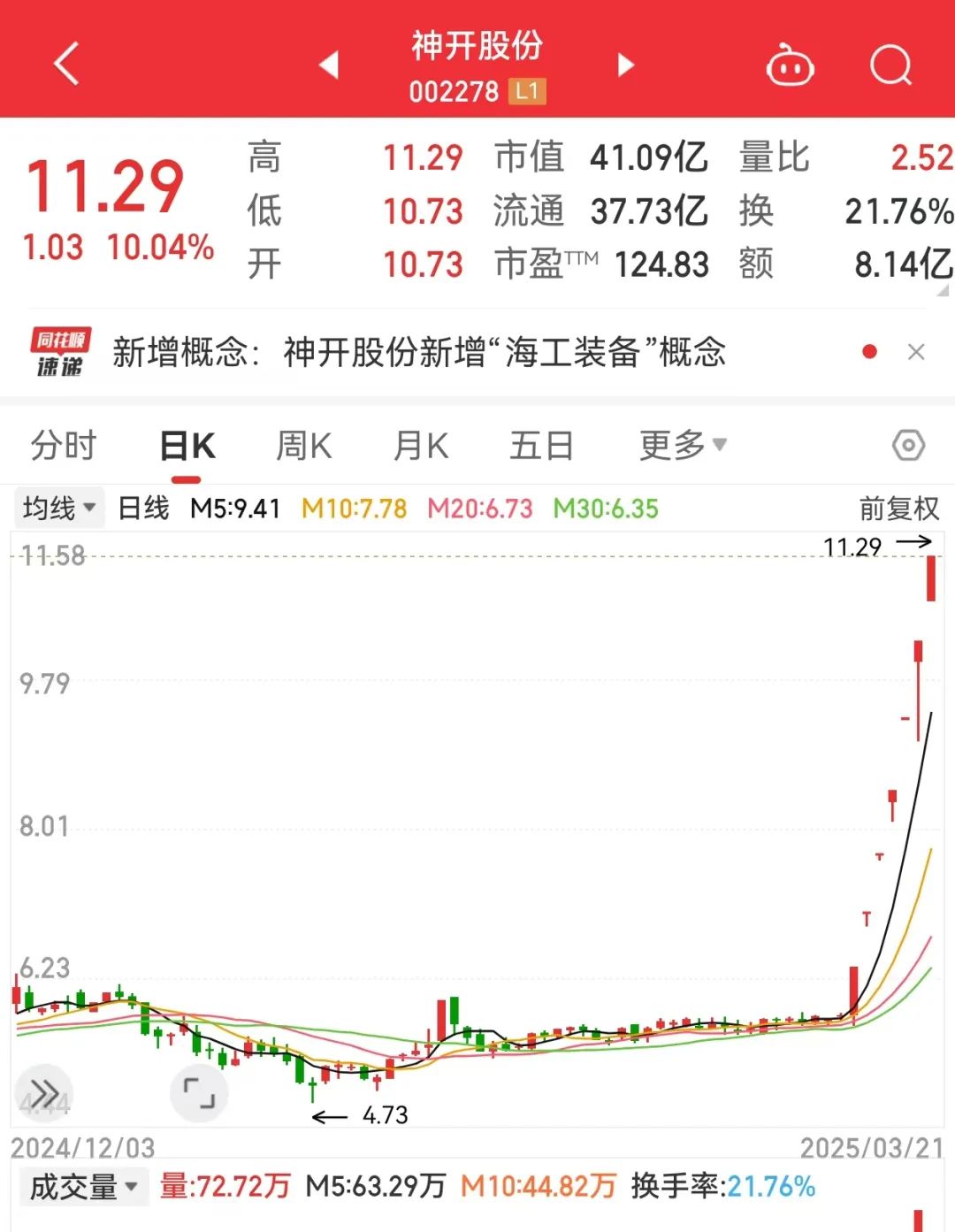 17只险资重仓股净利润增长。 3月21日早盘,A股市场低开低走,沪指跌近1%失守3400点,深证成指跌1.42%,创业板指跌1.7%。早盘成交额9796.68亿元,较昨日放量近千亿元。 板块上来看,深海科技概念逆市上涨,带动油气开采、水产、海上风电等概念走高。科技股集体回调,汽车、计算机、电子行业指数跌超2%,机器人、消费电子、半导体概念领跌。 深海科技股多股连续涨停,神开股份和巨力索具均实现7连板。消息面上,近日,漳州市发改委谋划起草《漳州市2025年海洋经济工作要点》,进一步明确年度工作目标及重点任务。其中,将加强统筹谋划,包括编制《“十五五”海上漳州建设专项规划》、开展政策研究、推进海洋经济重点项目建设等3项重点任务。
