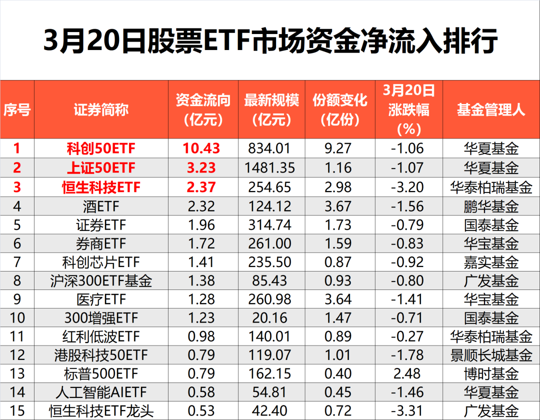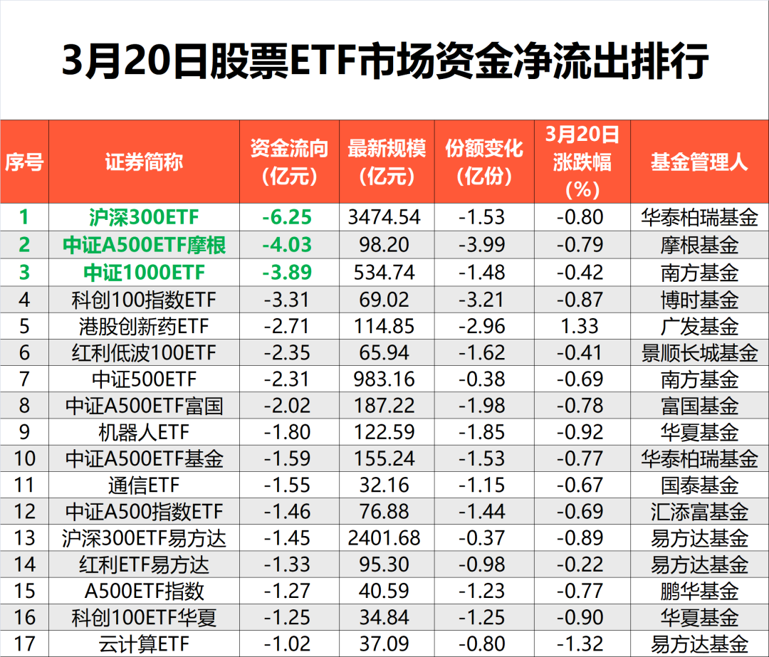 行业或主题ETF中,酒ETF、证券ETF、券商ETF、医疗ETF等净流入都超过1亿元,位居全市场前列。 谈及近期股市的变化,博时基金表示,整体来看,随着国内经济逐步企稳,政策支持力度加大,A股市场基本面支撑较为稳固,但投资者仍需保持理性,关注经济数据变化和政策落地情况,避免盲目“追涨杀跌”。 银河基金也表示,随着宏观政策定调积极、宽松措施加速落地的背景下,重点关注政策面、基本面变化带来的影响。 在此背景下,头部基金公司旗下ETF持续获得资金净流入。 易方达基金ETF最新规模为6150.9亿元,2025年以来规模增加144.4亿元。其中,昨日人工智能ETF、深证100ETF净流入靠前,创业板ETF、科创板50ETF也出现不同程度净流入。 华夏基金ETF中,3月20日,科创50ETF和上证50ETF单日净流入居前,分别净流入10.43亿元和3.23亿元,最新规模分别达834.01亿元和1481.35亿元,对应跟踪指数近一月日均成交额分别为48.35亿元和21.84亿元。人工智能AI ETF和自由现金流ETF分别净流入0.58亿元和0.49亿元。 宽基ETF净流出居前,单日净流出超40亿元 从资金流出方向看,细分品类中,宽基ETF净流出居前,净流出41.57亿元。规模变化方面,宽基ETF规模下降207.78亿元。 具体到指数维度,3月20日,中证A500指数单日净流出居前,达24.61亿元。其中,摩根、富国、华泰柏瑞基金旗下跟踪中证A500指数的产品,单日净流出均超1亿元,位居全市场前列。 沪深300ETF、中证1000ETF、科创100指数ETF等也都有超3亿元的净流出。