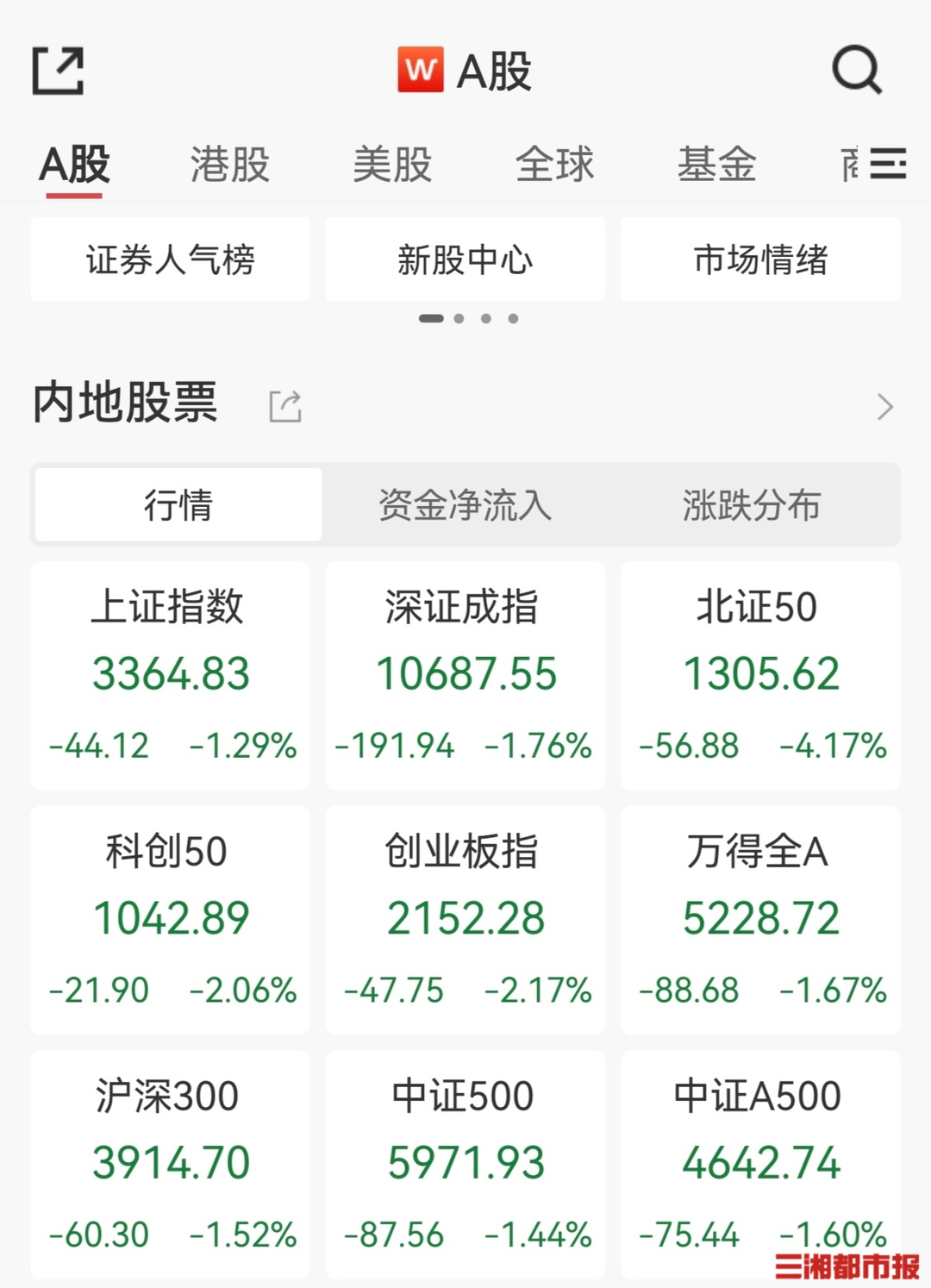华声在线3月21日讯(全媒体记者 潘显璇)横盘数日后,A股三大指数今日集体大跌,沪指失守3400点,全市场超4200只个股下跌。 截至收盘,沪指跌1.29%,报3364.83点;深证成指跌1.76%,报10687.55点;创业板指跌2.17%,报2152.28点。