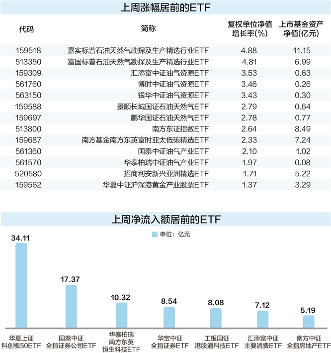证券时报记者 张智博 回顾上周,受国际地缘政治等因素影响,原油需求预期和黄金价格波动明显,带动相应主题ETF复权单位净值实现上涨。此外,热门科技板块估值高位承压。 机构建议投资者关注上市公司年报和一季报数据情况。 油气和黄金主题ETF涨幅居前 上周,ETF市场(被动指数型、QDII股票型)中,不足百只ETF录得上涨,占全市场ETF比例不足10%,仅有22只ETF复权单位净值上涨幅度超过1%。 分主题来看,上述22只ETF中,油气和黄金主题ETF涨幅居前。嘉实、富国标普石油天然气勘探及生产精选行业ETF复权单位净值增长率超过4.8%;汇添富、博时、银华中证油气资源ETF净值增长率超过3.4%。华夏、华安、永赢、工银、国泰中证沪深港黄金产业股票ETF增长率超过1.2%。 在过去一周里,石油石化行业指数涨幅居首,为1.51%。消息面上,早前,国际能源署下调全球原油需求预期、俄乌原则上同意短期停火,地缘政治和供需前景仍存不确定性。 光大证券表示,美国页岩油边际成本约为64美元/桶,参与原油市场边际成本定价,和OPEC+共同对原油市场形成支撑。地缘政治局势仍存不确定性,在市场对地缘政治的交易结束后,2025—2026年原油需求的稳定增长、OPEC+和美国页岩油的边际成本定价将继续奠定油价中长期维持高景气的基础。 近期,黄金价格突破新高。国际方面,COMEX黄金价格最高冲至3065.2美元/盎司,周涨幅0.9%;现货黄金价格最高冲至3057.51美元/盎司,周涨幅1.31%。国内方面,SHFE黄金价格最高冲至711.24元/克,周涨幅1.89%。 申万宏源表示,黄金本轮的快速上行依旧是受避险情绪及央行购金推动。地缘政治方面,中东局势再升级,避险情绪对金价支撑明显。中长期看,黄金驱动因素依旧较强,谨慎看多。 两类ETF获主力资金大幅净流入 从资金流向来看,上周,共计69只ETF净流入额在1亿元以上。华夏上证科创板50ETF、国泰中证全指证券公司ETF、华泰柏瑞南方东英恒生科技ETF排名前三,净流入额依次为34.11亿元、17.37亿元、10.32亿元。 在非宽基指数ETF中,证券板块获较多资金净流入。国泰中证全指证券公司ETF、华宝中证全指证券ETF净流入额依次为17.37亿元、8.54亿元。 申万宏源表示,监管推动供给侧改革(并购重组)、投资端改革(中长期资金入市)、融资端改革(股权融资边际有望松绑)为券商展业塑造稳定、活跃的环境,券商2025年有望进入新一轮业绩增长期,看好券商板块。 此外,嘉实上证科创板芯片ETF、国联安中证全指半导体ETF净流入额也均超过4亿元。中原证券表示,DeepSeek通过技术创新提升AI算力芯片的效率,进而加快国产AI算力芯片自主可控的进程,国产AI算力芯片厂商有望加速发展,并持续提升市场份额。叠加近年来美国不断加大对高端GPU的出口管制,国产AI算力芯片厂商迎来黄金发展期。 科技成长板块估值高位承压 从头部ETF(最新资产净值500亿元以上)表现来看,10只ETF复权单位净值集体下跌。华夏上证科创板50ETF、易方达上证科创板50ETF两只复权单位净值下跌最多,跌幅均超过4%。但同时,这两只ETF净流入额居前,依次为34.11亿元、3.87亿元。 华泰证券此前表示,今年以来,科技板块的结构性行情是指数表现核心推动力。随着指数升至关键位,科技板块内部也趋于拥挤。资金追高意愿受到影响,开始向红利等其他板块分流。近期,科技品种出现波动较大的情况,但权益市场指数层面暂不存在显著向下风险,风格切换的理由也不够充分,反而提供了再度加仓的机会。 展望后市。中原证券表示,美联储降息预期,外资回流或为市场提供增量资金支持。3月至4月为年报披露高峰期,公司盈利修复情况将直接影响市场信心,需警惕业绩不达预期的个股风险。短期资金偏好转向防御性板块,高股息红利资产表现稳健,而科技成长板块因估值高位承压,市场进入风格再平衡阶段。 (本版专题数据由证券时报中心数据库提供) |