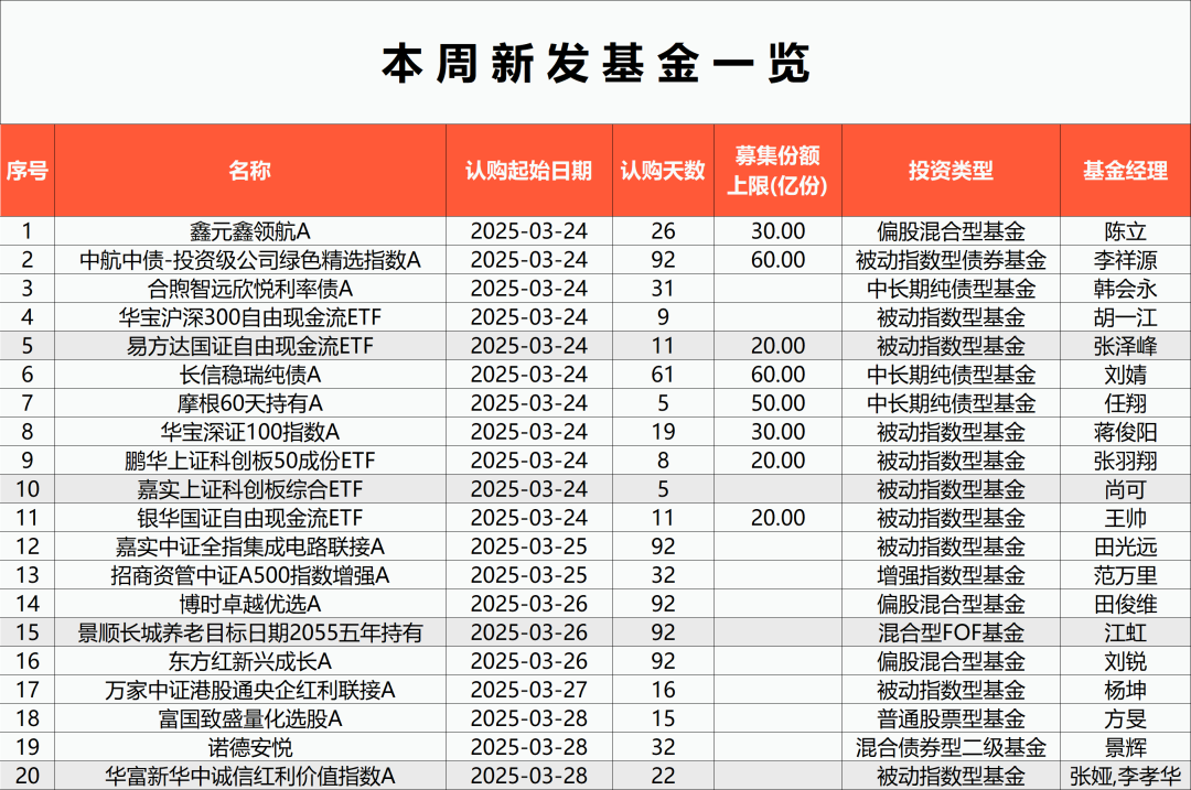 新的一周(3月24日—3月30日),新基金市场又有20只新品来了。 在近期股市回暖背景下,权益类基金成为新基金发行市场的绝对主力,今年权益类基金发行快速升温,3月份以来发行规模占比首次突破50%,凸显了市场回暖背景下资金向权益类资产倾斜的趋势。 本周权益类基金持续上新,接棒中证A500指数基金的发行热度,自由现金流主题基金陆续发力布局,一场新的发行“大战”即将上演。 权益类新基金占七成,自由现金流主题基金即将迎来发行“大战” Wind数据显示,3月24日至3月30日,共有20只新基金迎来发行,权益类基金仍是主力军。 20只新发基金中,有14只为权益类基金。其中10只为被动指数型基金,易方达、银华、华宝基金旗下自由现金流ETF纷纷出手。易方达、银华基金布局了国证自由现金流ETF,华宝基金布局了沪深300自由现金流ETF。 截至3月24日,全市场已有27家基金管理人布局了自由现金流主题基金,目前国泰基金旗下现金流ETF、华夏基金旗下自由现金流ETF已经成立,基金发行规模分别为14.31亿元、6.94亿元,产品上市后继续吸金,目前最新规模分别为25.15亿元、19.11亿元。 目前还有嘉实、摩根、永赢基金旗下自由现金流ETF“批而未发”,28只基金排队候批,一场新的基金发行“大战”即将打响。