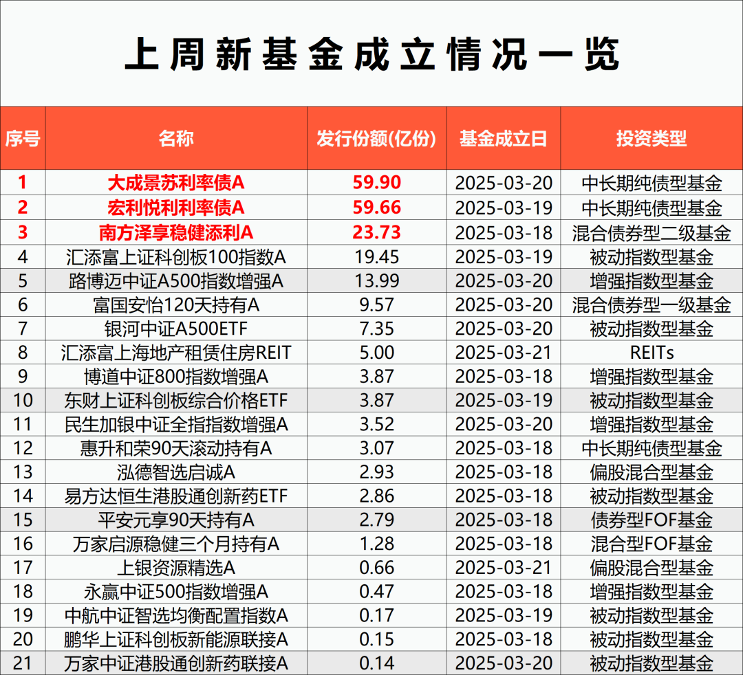 除了创新产品外,红利策略指数基金依然火热,万家中证港股通央企红利联接A、华富新华中诚信红利价值指数A也将在本周发行。 另外,中证A500指数增强基金也迎来新的玩家。3月25日,招商资管中证A500指数增强A即将发行,跟踪中证A500指数的公募产品又增添了新的投资工具。 此外,华宝深证100指数A、鹏华上证科创板50成份ETF、嘉实上证科创板综合ETF等指数产品,也将于3月24日纷纷面市。 主动基金方面,本周有三只偏股混合型基金迎来发行,分别是鑫元鑫领航A、博时卓越优选A、东方红新兴成长A。随着股市回暖、主动权益类基金超额收益回归,主动基金再度受到资金的青睐。 债券型基金方面,本周有三只纯债基金发行,分别为合煦智远欣悦利率债A、长信稳瑞纯债A、摩根60天持有A。另外,本周还各有1只债券指数基金、二级债基发行,在近期债市调整背景下,公募债基的发行有所降温。 权益类基金发行拾级而上,年内发行规模占比首次超过50% 虽然今年债市表现低迷,但近日发行的多只利率债基,仍有不错的发行成绩。 上周成立的大成景苏利率债A、宏利悦利利率债A两只利率债基,皆有近60亿元的发行成绩,位居当周市场靠前位置。二级债基中,南方泽享稳健添利A也斩获近24亿元的发行成果。 另外,指数型基金中,汇添富上证科创板100指数A发行规模超19亿元,路博迈中证A500指数增强A发行规模近14亿元,也位居市场靠前位置。