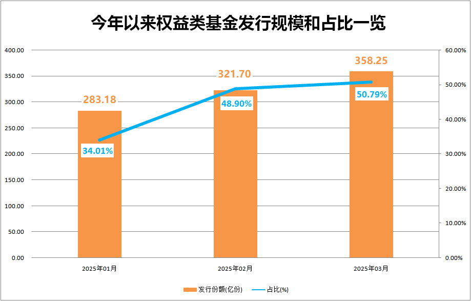 在今年股市回暖背景下,权益类基金发行也拾级而上。 Wind数据显示,截至3月24日,三月份以来权益类基金发行规模已超358亿份,连续两个月上台阶。权益类基金发行规模在新基金中的占比,也于今年首次突破50%,成为新基金发行市场主流品类,标志着权益类基金再回“C位”,成为各路资金最青睐的产品类型。