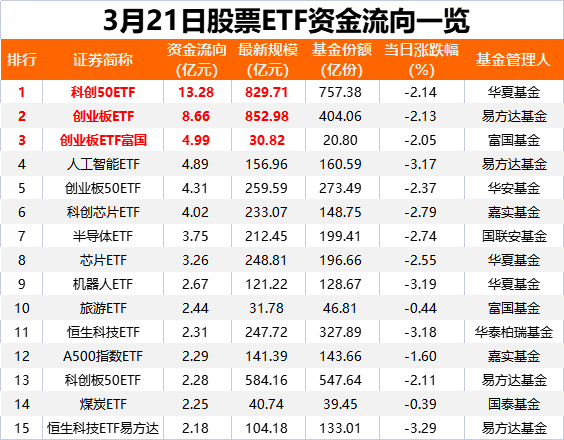上周五(3月21日),A股三大指数集体回调,沪指跌1.29%,深证成指跌1.76%,创业板指跌2.17%。当日股票ETF(含跨境ETF,下同)市场净流出资金超30亿元。其中,行业ETF及港股ETF净流入居前,宽基ETF净流出居前。 股票ETF单日净流入31.09亿元 Wind数据显示,截至3月21日,全市场1034只股票ETF总规模达3.35万亿元。按照成交均价测算,当日净流入资金约31.09亿元。 据华夏基金统计,细分品类中,行业ETF及港股ETF净流入居前,分别净流入18.44亿元和10.27亿元。具体到指数维度,3月21日,科创50指数、恒生科技指数单日净流入居前,分别净流入17.85亿元和7.82亿元,沪深300指数单日净流出居前,达8.14亿元。从近5个交易日角度观测,科创50指数累计净流入44.41亿元。 另据易方达基金统计,3月21日,创业板指数净流入17.8亿元、科创板50指数净流入17.8亿元、半导体净流入16.3亿元、港股科技净流入11.8亿元、人工智能净流入10.4亿元。 市场宽幅震荡中,头部基金公司旗下部分ETF获得资金净流入。3月21日,易方达基金ETF最新规模6046.2亿元, 2025年以来规模增加39.7亿元。创业板ETF净流入8.6亿元,同类规模第一的人工智能ETF净流入4.8亿元,科创板50ETF净流入2.3亿元,恒生科技ETF易方达净流入2.1亿元,医药ETF净流入1.1亿元。 华夏基金旗下ETF中,3月21日,科创50ETF单日净流入居前,净流入13.28亿元,芯片ETF和机器人ETF分别净流入3.26亿元和2.67亿元,恒生互联网ETF和自由现金流ETF净流入都超1亿元。