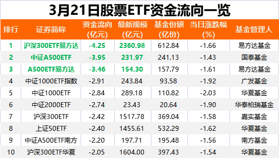 宽基ETF净流出居前 在股票ETF整体资金净流入的同时,仍有部分指数出现净流出。 3月21日,宽基ETF净流出居前,净流出3.88元。规模变化方面,宽基ETF规模下降355.24亿元。具体到指数维度,沪深300指数单日净流出居前,达8.14亿元。 华南一家基金公司表示,近期市场高位波动,行业与风格分化愈加明显,表征市场整体表现的沪深300指数、中证A500指数等核心宽基相关ETF份额出现一定回落。此外,经历春节后市场的持续反弹后,部分短期资金选择获利了结。 此外,春节以来,由于中国在AI和机器人领域的亮眼表现,A股的科技成长板块强势爆发。短时间内累计涨幅过大、估值处于历史高位,导致了近期核心宽基ETF出现资金流出。
