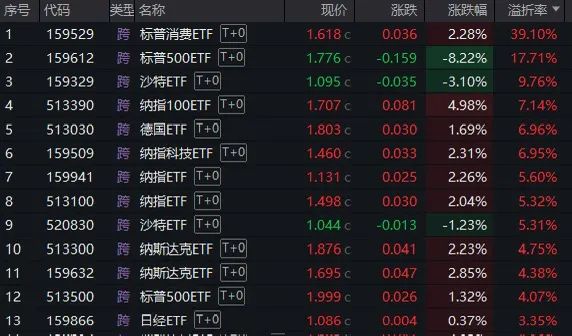 A股跌宕起伏之时,跨境ETF再现高溢价。 3月24日,A股三大主流股指均微幅收涨,但盘中走势震荡明显,均走出先抑后扬的表现。 在A股震荡时,多只跨境ETF(交易型开放式指数基金)再次因大幅上涨出现高溢价情形,多只纳指ETF涨超2%,相对IOPV(份额参考净值)溢价率高达5%以上。其中,纳指100ETF盘中最高涨超8%,最终收涨近5%,溢价率为7.14%。此外,标普消费ETF溢价率超过39%,标普500ETF溢价率超过17%。 为了提示投资者高溢价炒作背后的风险,多家公募基金公司再度发布风险提示公告,部分公司采取了开市临时停牌一小时等措施来警示风险。