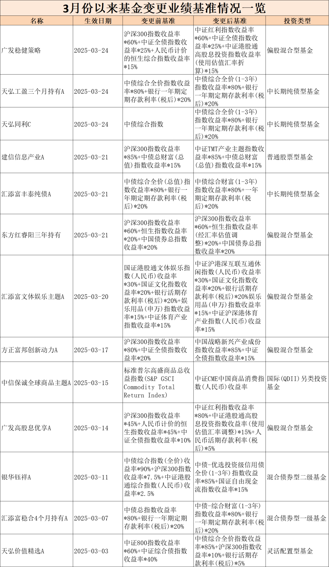 公募基金的业绩比较基准是衡量投资表现的标尺,更是基金经理能力的“试金石”,目前正悄然发生着变化。 中国基金报记者发现,3月中旬以来,广发、天弘、建信、汇添富、东方红资管、方正富邦、中信保诚等多家基金公司旗下产品宣布变更业绩基准,今年以来宣布变更业绩基准的产品数量达到82只(各类型分开计算)。 仅从权益类产品来看,不少以沪深300指数等宽基为基准的产品,变更为采取中证红利指数、中证TMT产业主题指数、中国战略新兴产业成份指数等更能体现产品风格的行业指数为业绩比较基准,定位更加精准。 对此,业内人士表示,一方面,变更基准可以与基金经理策略更加贴合,改善基金和业绩基准不匹配的情况;另一方面,或是行业内对公募基金改革方案渐行渐近以及《公募基金业绩比较基准指引》将要出台的提前应对。 多只基金宣布变更基准 3月份以来,包括广发、天弘、建信、汇添富、东方红资管、方正富邦、中信保诚在内的多家基金公司旗下产品宣布变更业绩基准。