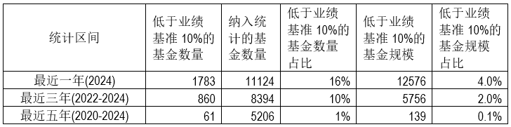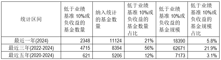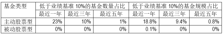 (截止日期:2024年12月31日。注:统计仅纳入基金主份额,规模统计取2024年底数据,统计最近三年和五年收益低于业绩基准10%时取年化值进行比较,下同。) 值得注意的是,由于基金类型及运作方式各异,管理不同类型产品的基金经理面临的考核标准可能也会有所不同。例如,对于债券型基金而言,年化收益率低于业绩基准10%的概率极低,最近三年仅有1%的基金,规模占比为0.5%。然而,若采用累计收益率计算,低于标准的概率则显著提升,最近三年和最近五年分别有8%和10%的债券基金低于该标准。另外,对于跟踪指数的被动基金,其收益率低于基准10%的可能性更是微乎其微,最近三年和最近五年均没有被动股票型基金触及这一标准,因此可能会采用不同的考核标准。 图表2:各类型基金中低于业绩基准10%的基金数量及规模占比情况