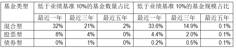 图表3:各类型基金中低于业绩基准10%的基金数量及规模占比情况