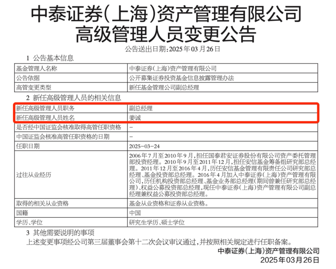 又有“百亿元级”绩优基金经理高升。 3月26日,中泰证券资管公告,公司权益公募投资部总经理姜诚升任公司副总,成为基金经理“绩而优则仕”的最新案例。 姜诚升任中泰证券资管副总 资管行业再迎新一位投研副总。 3月26日,中泰证券资管发布高级管理人员变更公告,任命姜诚为公司副总经理。
