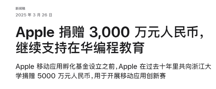3月26日,苹果公司宣布向浙江大学捐赠3000万元人民币,作为其对中国下一代开发者的支持。