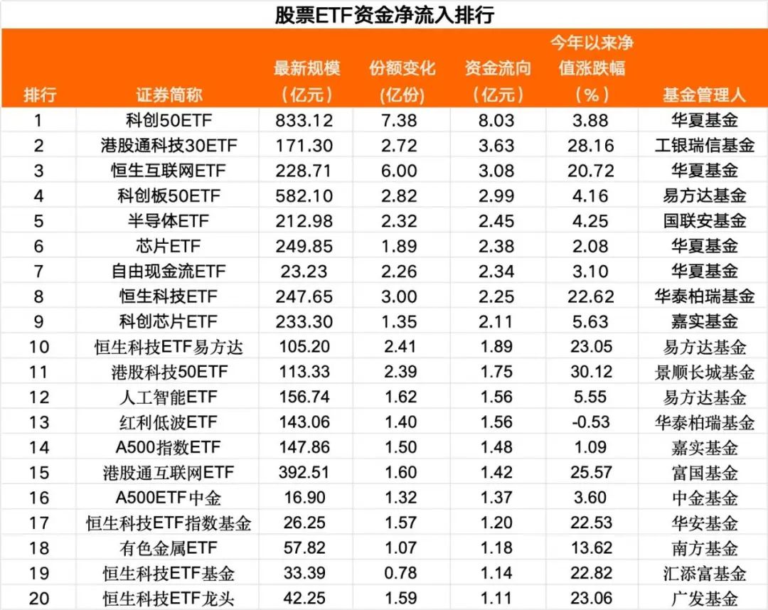 3月25日(本周二),A股市场持续震荡,三大指数小幅收阴,两市成交1.26万亿元,创近期新低。 3月25日,股票ETF出现超20亿元资金净流入,跟踪科创板50、港股科技、恒生互联网等指数的宽基ETF,以及半导体、芯片、人工智能等行业主题ETF资金净流入靠前。 值得一提的是,这已是连续第三个交易日资金净流入,合计净流入资金超百亿元。3月以来,部分代表性港股科技、港股互联网等ETF“吸金”已超240亿元。 股票ETF连续三个交易日净流入,“吸金”超百亿元 Wind数据显示,截至2025年3月25日,全市场股票ETF达到1034只(含跨境ETF,下同),总规模为3.35万亿元。 从资金流向看,3月25日,市场震荡之际,股票ETF净流入资金超20亿元,这也是连续第三个交易日资金净流入,合计超百亿元。当日资金净流入超过1亿元的股票ETF达23只,科创、港股相关ETF吸金居前。华夏科创50ETF、工银瑞信港股通科技30ETF、华夏恒生互联网ETF位居前三,资金净流入均超3亿元。 来自易方达基金的数据显示,3月25日,五类ETF资金净流入居前,分别为港股科技(净流入15.1亿元)、科创板50(净流入12.5亿元)、半导体(净流入9.4亿元)、人工智能(净流入5.4亿元)、港股互联网(净流入4.9亿元)。 Wind数据显示,资金净流入前20大股票ETF中,港股科技或互联网相关ETF达到9只,科创相关ETF也达到3只。从近5个交易日角度观测,科创50指数累计净流入57.03亿元。 值得一提的是,近期港股相关ETF成为“吸金”主力。3月以来,多只代表性港股科技、港股互联网、恒生科技ETF等合计资金净流入超240亿元。 头部基金公司中,易方达基金ETF最新规模为6040.5亿元。3月25日,科创板50ETF净流入3.0亿元,恒生科技ETF易方达净流入1.8亿元,同类规模第一的人工智能ETF净流入1.6亿元,纳指ETF易方达净流入1.0亿元,上证50ETF易方达净流入0.5亿元。 华夏基金ETF中,3月25日,科创50ETF和恒生互联网ETF单日净流入居前,分别净流入8.03亿元和3.08亿元,最新规模分别达833.12亿元和228.71亿元,对应跟踪指数近一月日均成交额分别为44.89亿元和52.67亿元。芯片ETF和自由现金流ET净流入超2亿元,机器人ETF净流入超1亿元。