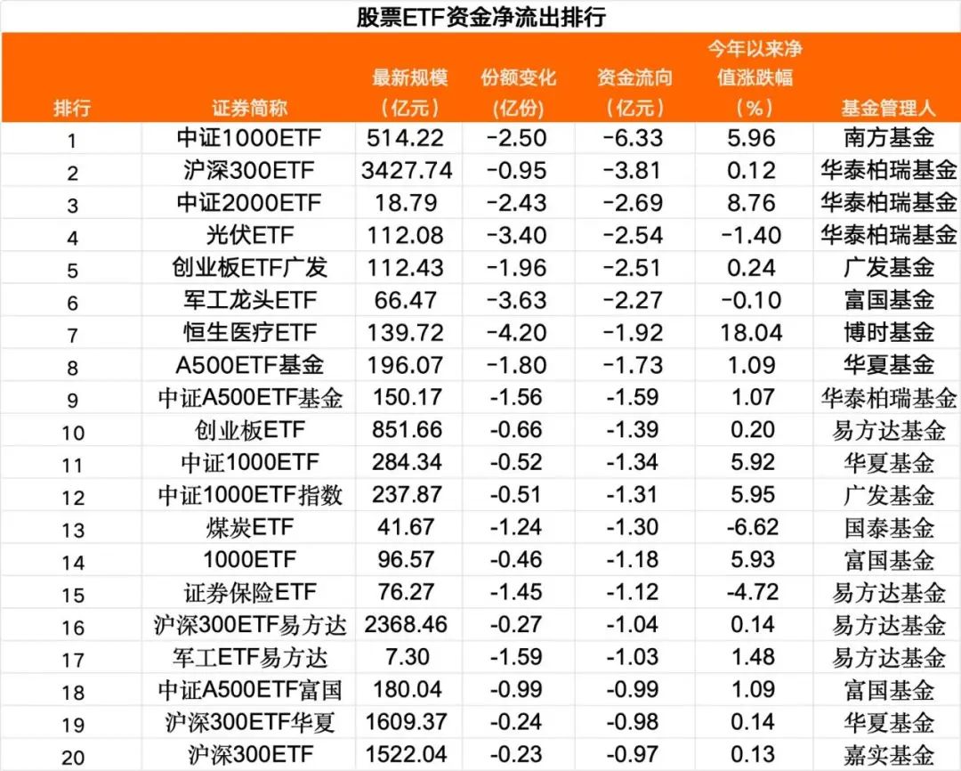 部分宽基和行业ETF资金净流出居前 3月25日,部分股票ETF资金净流出较多,超过1亿元的有17只,其中跟踪中证1000、沪深300、中证2000等指数的宽基ETF“失血”靠前。 Wind数据显示,3月25日,净流出前20大股票ETF中,中证1000指数净流出金额居前,4只相关ETF合计净流出超10亿元;4只沪深300ETF合计净流出近7亿元,中证A500ETF有3只,资金净流出超过4亿元。 值得一提的是,3月以来市场持续震荡调整,股票ETF以资金净流出为主,合计“失血”超90亿元。港股通互联网、港股通科技、科创50、恒生科技等相关ETF资金净流入居前,跟踪沪深300、上证50、中证1000等指数的宽基ETF成为资金净流出主阵营。 富国基金认为,从日历效应的角度来看,A股素有“四月决断”的说法,四月不仅是一季度经济数据披露窗口,也是上市公司财报披露期(4月、7月、10月),业绩增速对股价的影响要明显高于其他月份,同时资本市场对于基本面的关注度也有显著提升。 “站在3月下旬的重要过渡期,从近期公布的金融数据和出口数据来观察,宏观经济复苏仍面临一定程度的压力,由此也使得市场预期趋于谨慎。” 在富国基金看来,面对市场风格阶段性的再平衡,政策牵引的主线和新产业趋势均存在着机会:科技成长短期虽有波动,但仍不改中期主线逻辑;低利率时代下,红利资产也仍是不少投资者进行底仓配置的较佳选择之一。 鹏华基金罗英宇表示,部分科技股短期涨幅已偏离业绩增速,外部贸易摩擦不确定性可能导致市场波动加剧,因此,投资者需在把握产业趋势的同时保持风险意识。不过,随着经济基本面的持续改善和政策支持,科技股估值重估的趋势仍有望持续。 此外,金鹰基金对年内成长风格的占优依旧看好,短期仍建议关注高政策预期赛道,仍需警惕海外经济的动荡因素,关注黄金和军工板块在全球政治经济敏感期的风险对冲价值。