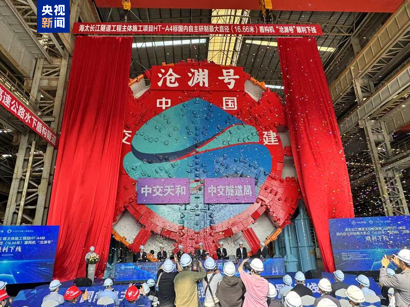 海太长江隧道位于江苏省长江入海口,北起南通市海门区,南至苏州太仓市,线路全长39.07公里,其中盾构隧道长9327米,是世界最长高速公路水下盾构隧道。本次下线的“沧渊号”开挖直径达16.66米,整机总长176米,总重量超5650吨,创国产超大直径盾构机新纪录。这也彰显了我国国产超大直径盾构机研制和应用实现新跨越。